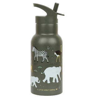 Dubbelwandige thermosfles van roestvrij staal met savannedieren. De fles wordt standaard geleverd met draaidop, drinktuit en rietje voor koude dranken. Een rvs-draaidop voor warme dranken wordt los verkocht.