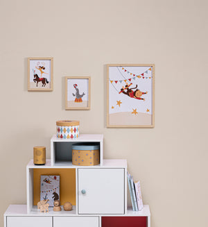 Opbergdozen in karton in circus thema zijn veelzijdige en speelse opbergoplossingen die zowel functioneel als decoratief zijn. Deze dozen zijn gemaakt van stevig karton en zijn bedrukt met kleurrijke illustraties en motieven die geïnspireerd zijn op het levendige en vrolijke karakter van het circus.