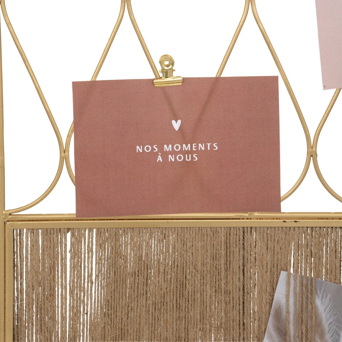 Ontworpen in een mix van verguld metaal en natuurlijk jute touw, biedt de “Lindsay” fotohouder delicate patronen en harmonieuze afmetingen. De houder is voorzien van 5 clips om foto's aan te bevestigen en je kunt ook kaarten tussen de draden van het touw schuiven. Ideaal om de sfeer van een hal of slaapkamer op te vrolijken!