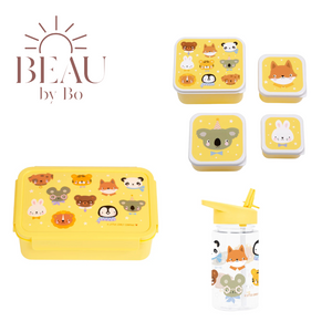 Deze gele lunch & snack box set met dierendesign is ideaal om mee te nemen naar school of onderweg. De set bestaat uit vier boxen in verschillende maten. Hierdoor zijn ze gemakkelijk in elkaar te stapelen en op te bergen.
