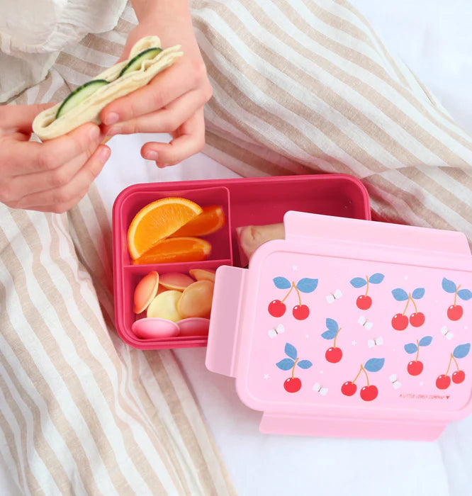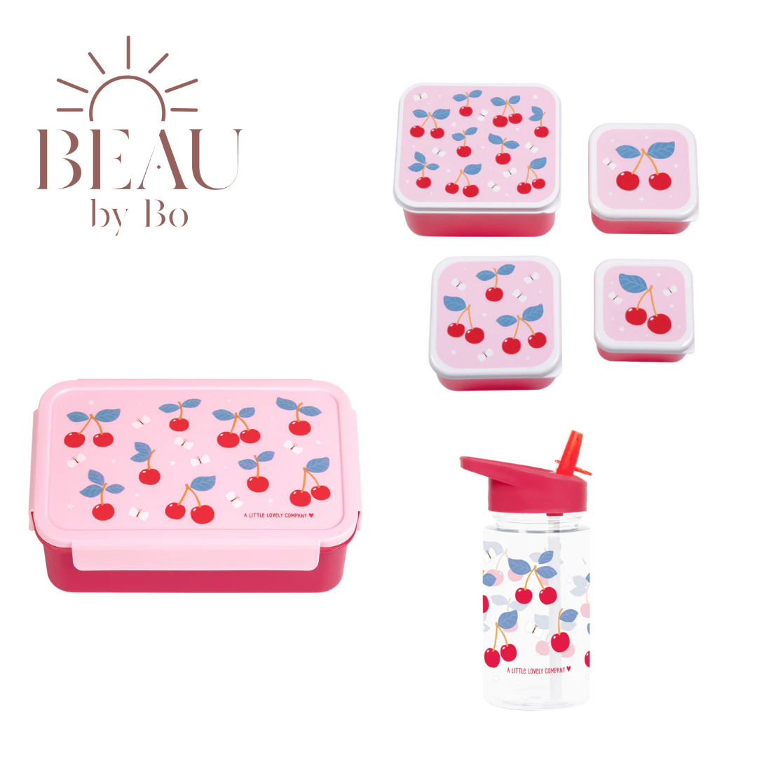 Deze roze lunch & snack box set met kersendesign is ideaal om mee te nemen naar school of onderweg. De set bestaat uit vier boxen in verschillende maten. Hierdoor zijn ze gemakkelijk in elkaar te stapelen en op te bergen.