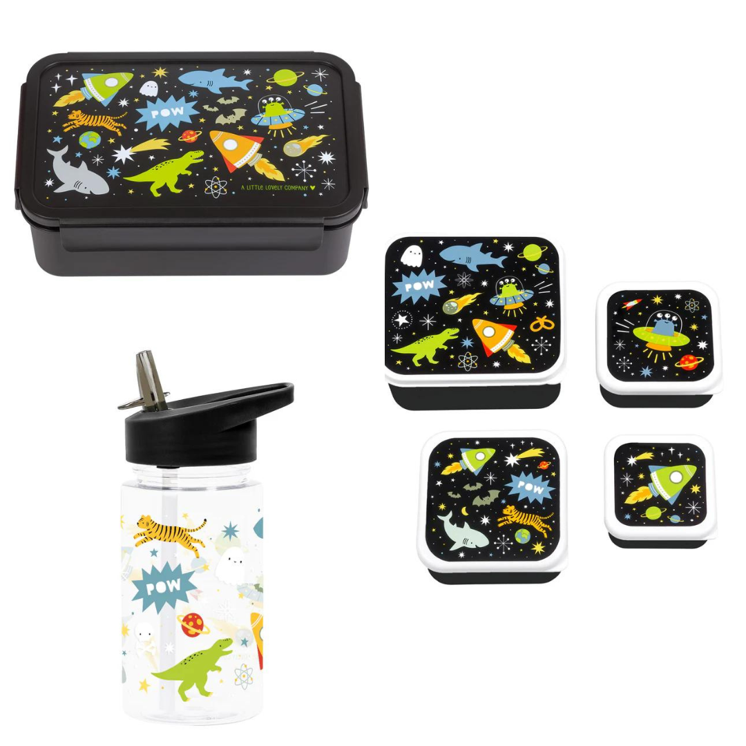 Dieses Black Lunch & Snack Box Set mit Raketen, Planeten und Stars ist ideal, um zur Schule oder auf der Straße zu gehen. Das Set besteht aus vier Kisten in verschiedenen Größen. Dies macht sie leicht zu stapeln und zu lagern.