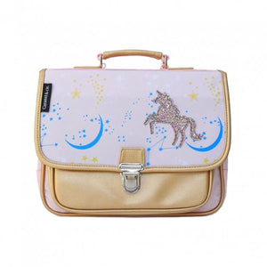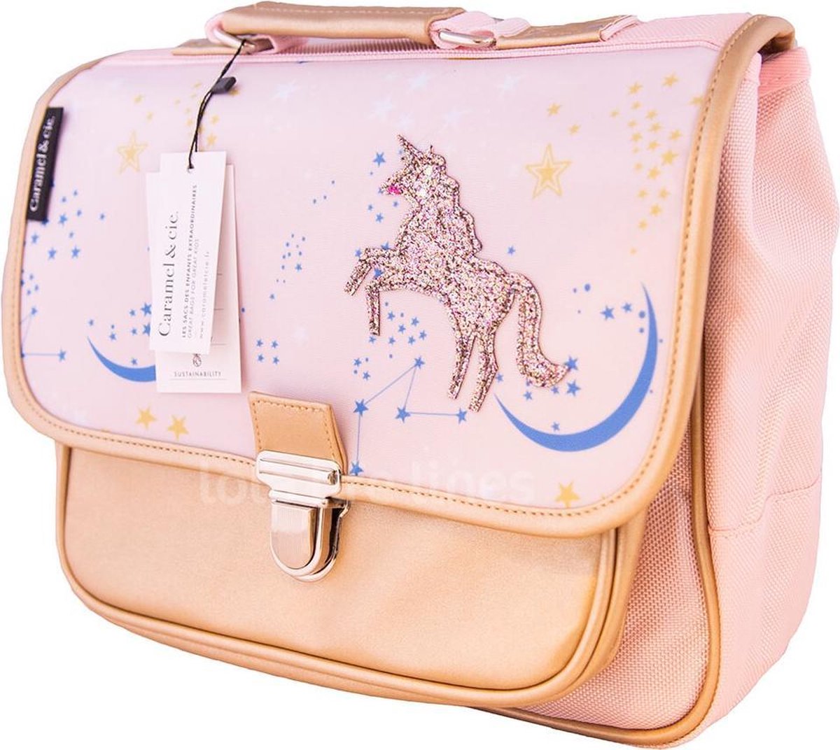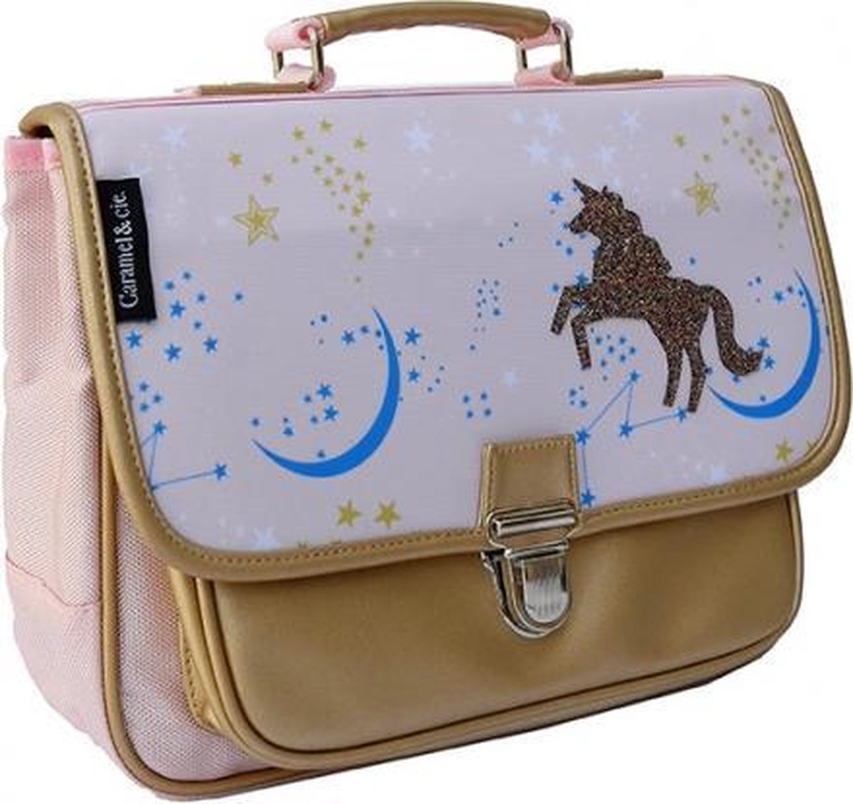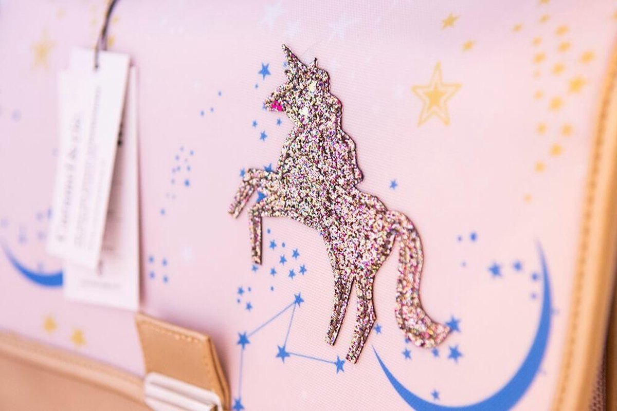 Deze kleuterboekentas werd ontworpen door Caramel & Cie, is bestemd voor stoere meisjes of jongens en werd versierd met een coole eenhoorn met glitter.