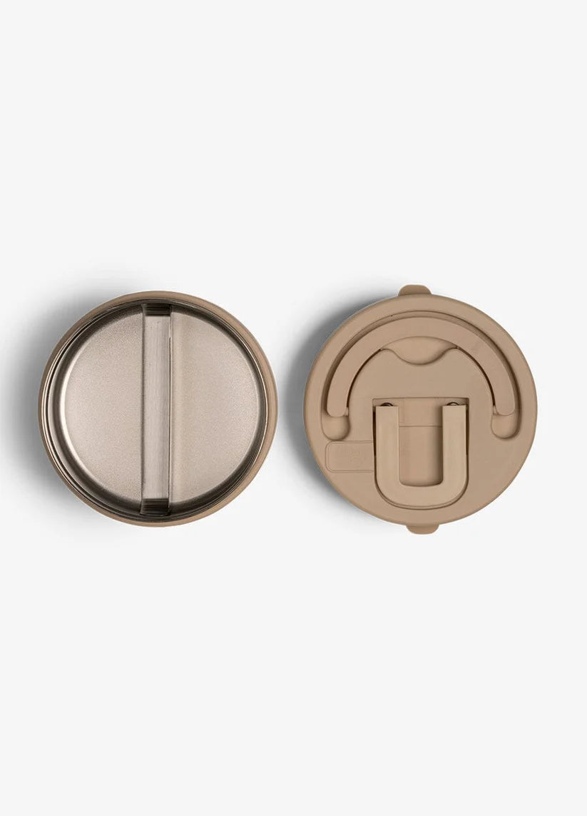 + Deckel lässt sich vertikal öffnen, ohne dass man ihn drehen muss, also einfach für kleine Hände.