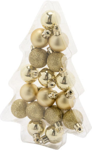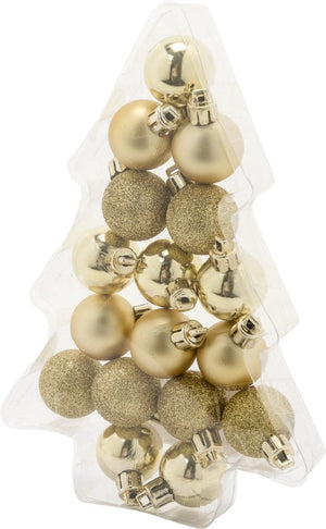 17x stuks kleine kunststof kerstballen goud 3 cm mat/glans/glitter. Set van onbreekbare kerstballen met een matte, glanzende en glitter afwerking. Kerst versiering/decoratie voor het optuigen van uw kerstboom. Deze kerstballen worden zonder ophangdraadjes geleverd, wij adviseren u om onze kerstbalhaakjes mee te bestellen (niet inbegrepen).