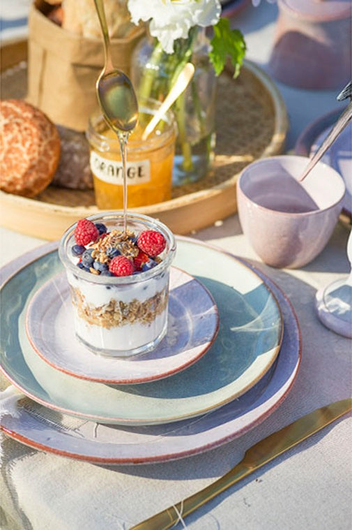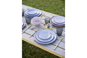 Eleonora is een aardwerken serviescollectie met een uniek uitzicht. Eerst en vooral valt de kleur op: zacht lichtroze met donkerdere spikkels en randen. Daarnaast zijn ook de vorm en de afwerking opmerkelijk. De borden zijn niet perfect rond en hebben een ondiep reliëf in het oppervlak en asymmetrische boorden. De reeks Eleonora is perfect te combineren met haar zusje Theodora, met haar lichtblauwe kleur.