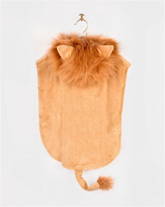 Leeuwencape met oren op de capuchon en staart op de rug. Namaakbont op de capuchon en aan het einde van de staart. Klittenbandsluiting aan de voorkant en elastische linten aan de zijkanten.