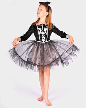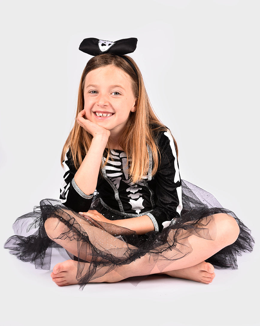 Skelettoutfits waren noch nie so süß. Paula ist ein schwarzes Kleid mit einem Skelettdruck. Der schwarze Glitzer -Tüllrock hat auch einen silbernen Satin -Petticoat. Das Oberteil ist in weichem, gemütlichem Samt genäht. Silber Glitzerdetails. Die passende Tiara mit einem großen, gepolsterten Bogen- und Schädeldetail ist im Kostüm enthalten.