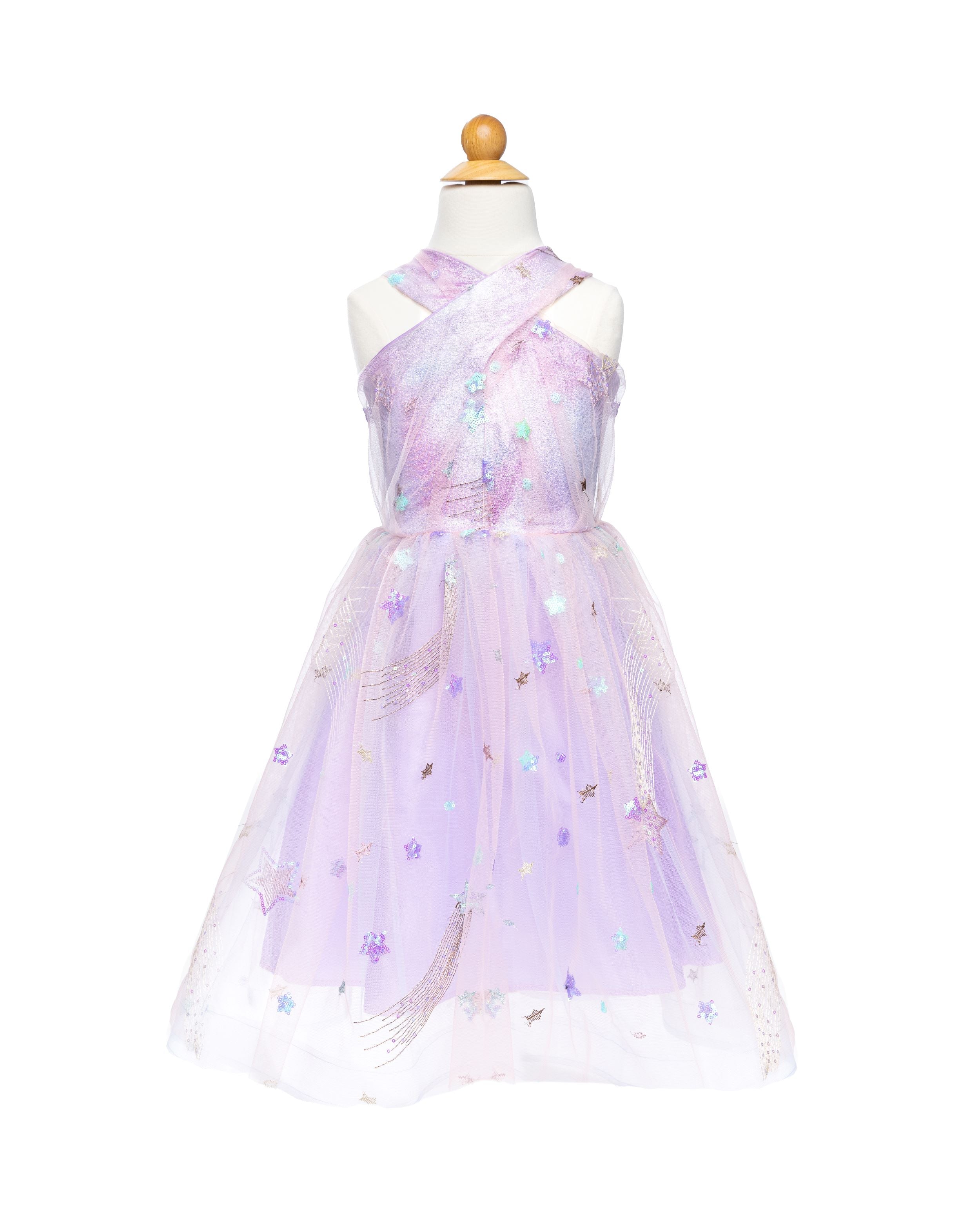 Versierd met een sterrenconstellatie voegt deze jurk een vleugje hemelse charme toe aan elke gelegenheid. De lila tint zorgt voor een zachte en elegante touch, terwijl de gekruiste top een speels en stijlvol element toevoegt.