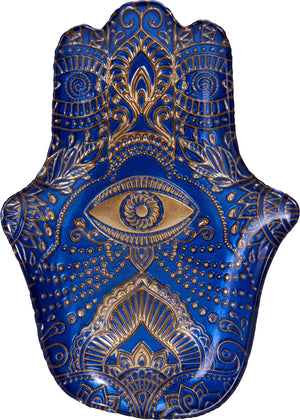 Breng stijl, symboliek en elegantie in huis met dit prachtige glazen bord in de vorm van de Hamsa hand. Het diepe blauw gecombineerd met gouden details geeft het bord een luxe en mystieke uitstraling.