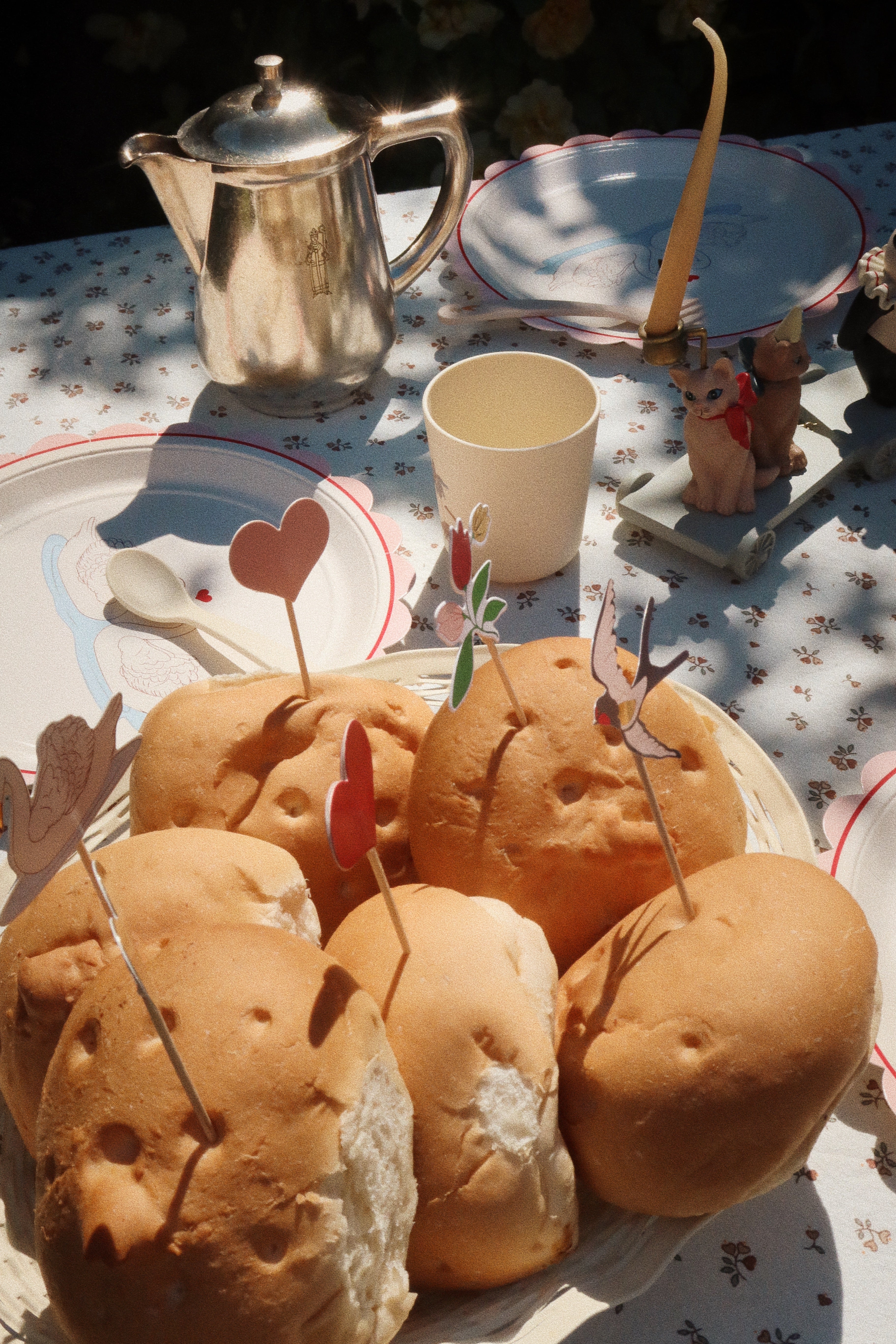 Materialen: Bekers: Papier, Borden: Papier, Servetten: papier, Slinger: papier, katoenen touw, Ballon: Aluminiumfolie, Taarttoppers: papier, bamboestok