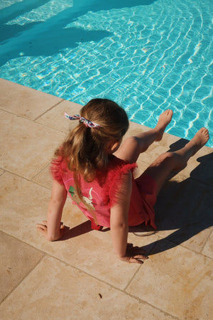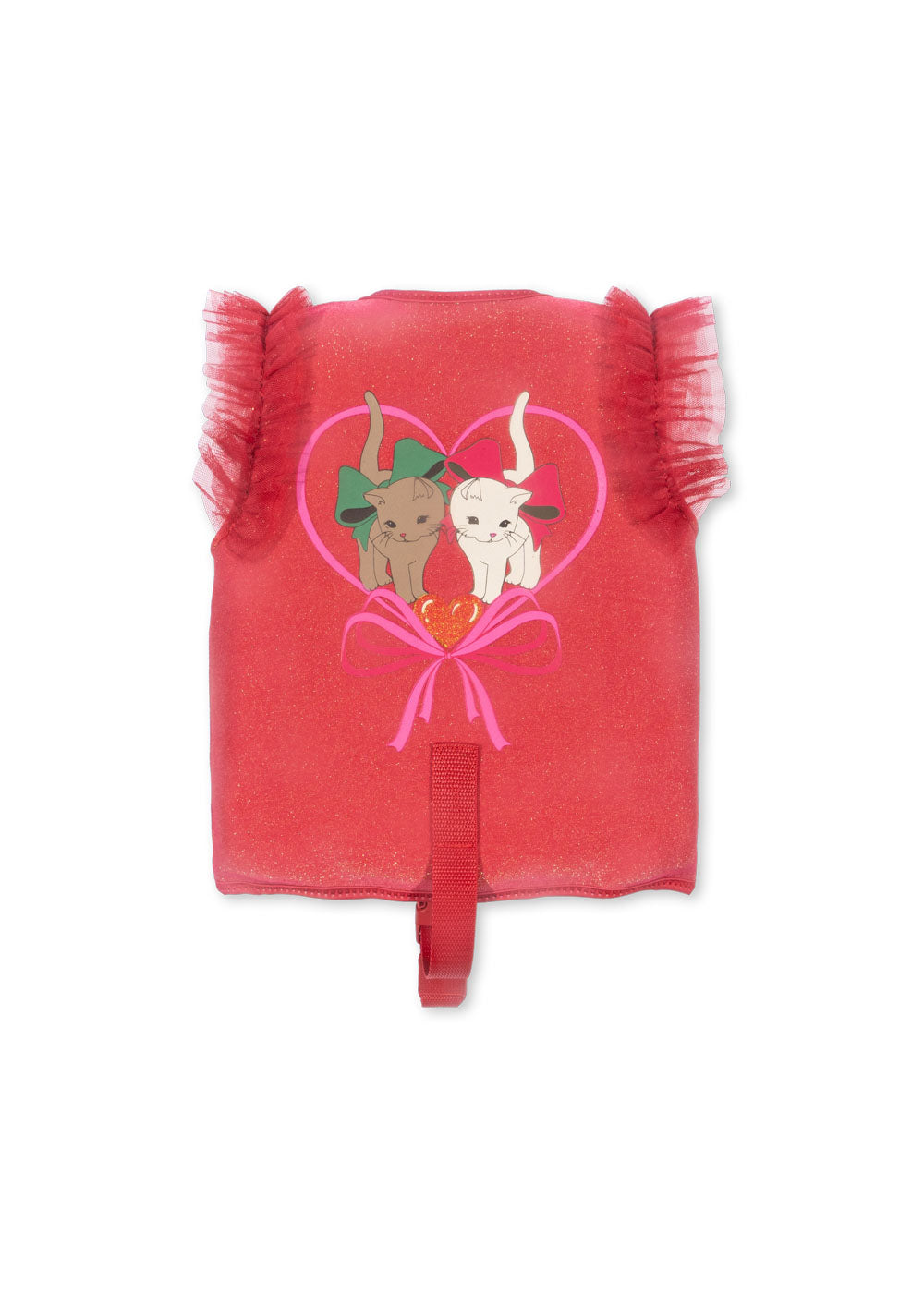 Vlot vest met glinsterend effect en franje op de schouders. Ontworpen met zowel een rits- als klittenbandsluiting en een veiligheidsriem met gesp in het kruis. Een drijfvest is het perfecte zwemaccessoire als je kleintjes net beginnen met spetteren. Het voegt een natuurlijk drijfvermogen toe en helpt ze zich op hun gemak te voelen in het water terwijl ze zelfstandig leren zwemmen.