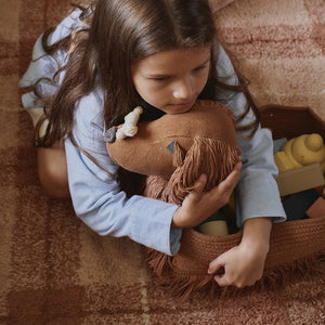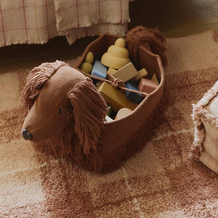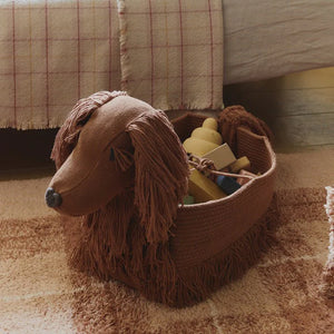 Maak kennis met Poppy en haar harige staart! Deze handgemaakte mand is geïnspireerd op het silhouet van een setterhond. Ontdek de details van Poppy: gelaagde franjes op de oren en staart en geborduurde wimpers. Een touw langs de zijkanten helpt de structuur te behouden en als speelse finishing touch is er een klein speelgoedbotje aan het label bevestigd.