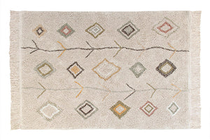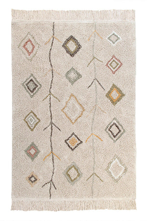 Rechthoekig wasbaar katoenen tapijt met een veelkleurig, op de Berbers geïnspireerde ruitmotief in ingetogen aardetinten van olijfgroen, honing, aardebruin, ivoor en vintage naakt. Het etnische ontwerp steekt af tegen een natuurlijke achtergrond, getuft op een katoenen canvas basis die aan de randen uitloopt in warrige franjes.