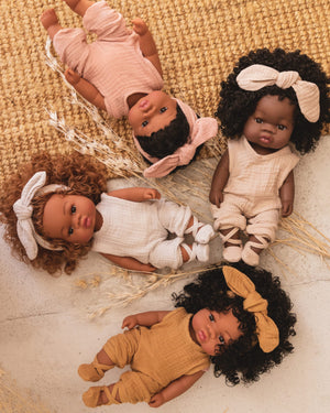 Elke Loreta bevat een set ondergoed, een hoofdband, een jumpsuit en een paar schoenen, handgemaakt in Portugal van 100% katoenen gaasstof. De extra stevige verpakking is gemaakt van gerecycled karton.