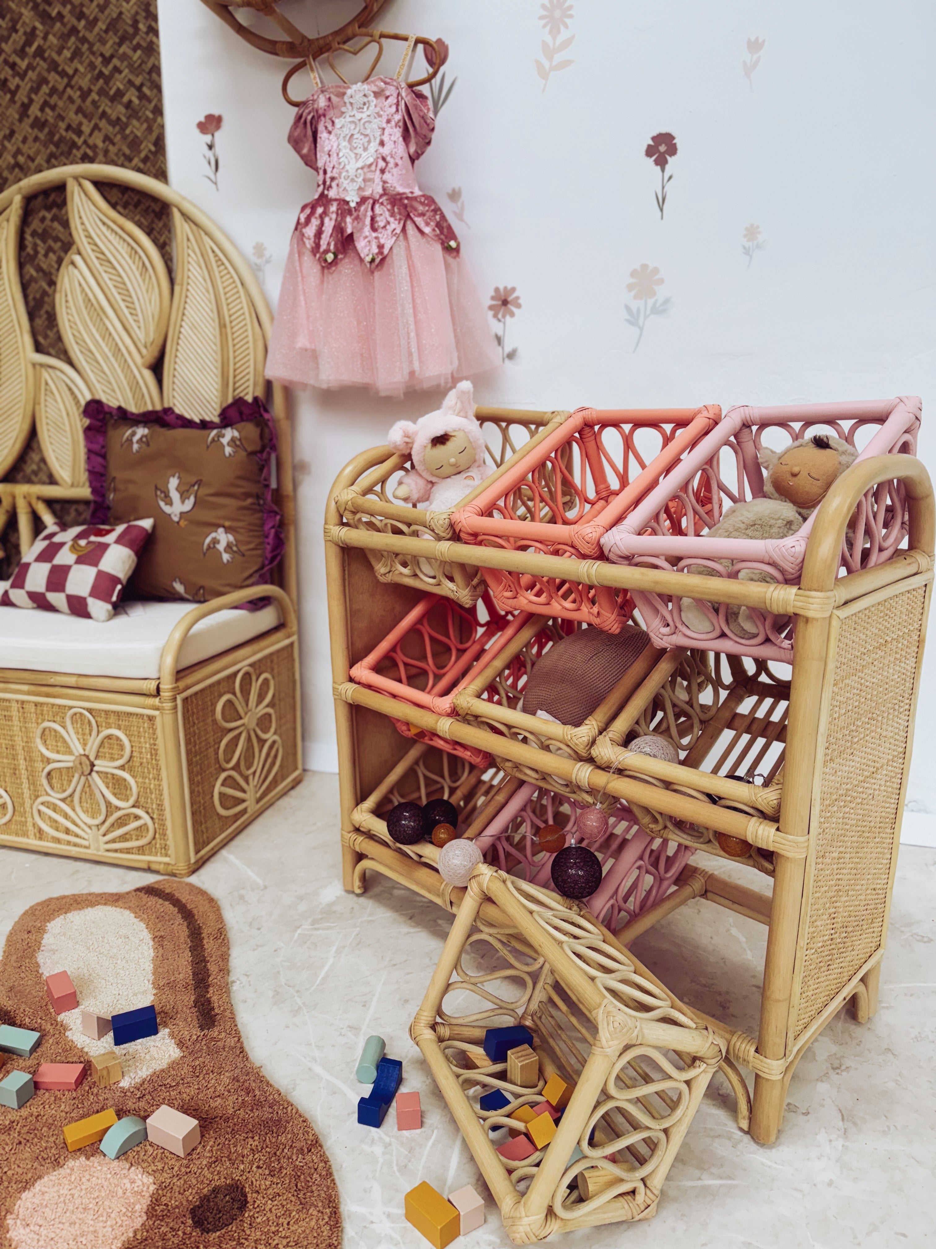 Dies ist ein Rattan -Speichermöbel mit einem von Vintage inspirierten Design. Wir fügen einige weiche Farben hinzu, die ideal für ein Mädchenzimmer sind.