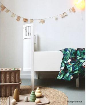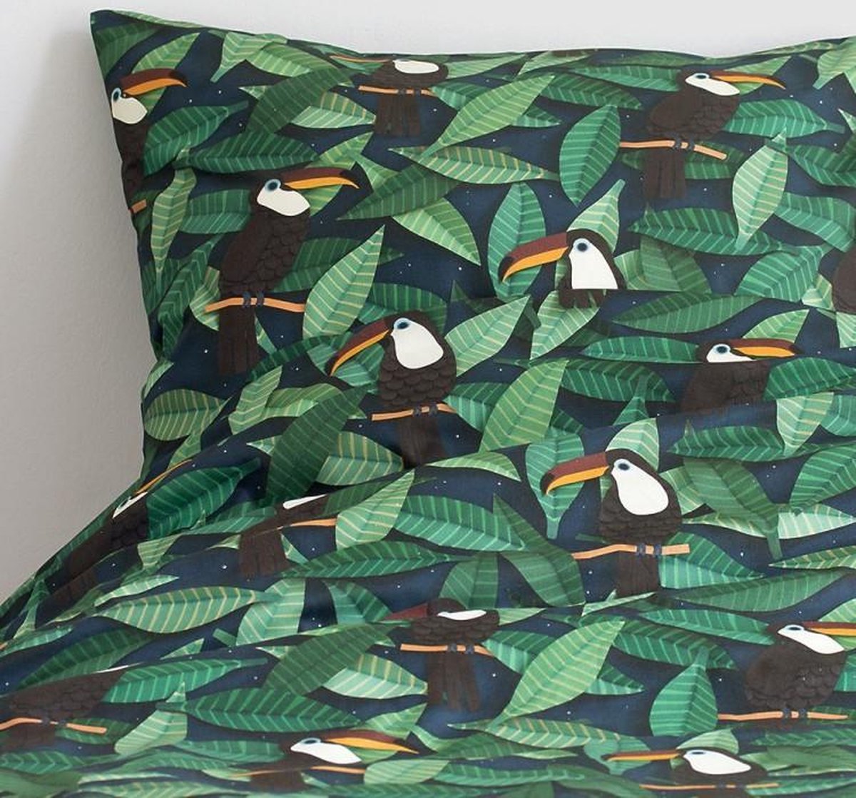 Studio Ditte - junior dekbedovertrek met eigenwijze toekans verscholen tussen een fris groen bladerdek. Perfect beddengoed voor een kinderkamer in jungle stijl. De print is haarscherp weergegeven op zacht katoen. De achterkant van het overtrek is uitgevoerd in een mooie donkerblauw. Je kind zal heerlijk dromen onder dit mooie kinderbeddengoed.
