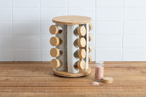 • Rotating bamboo spice rack with 12 jars, spices not included.