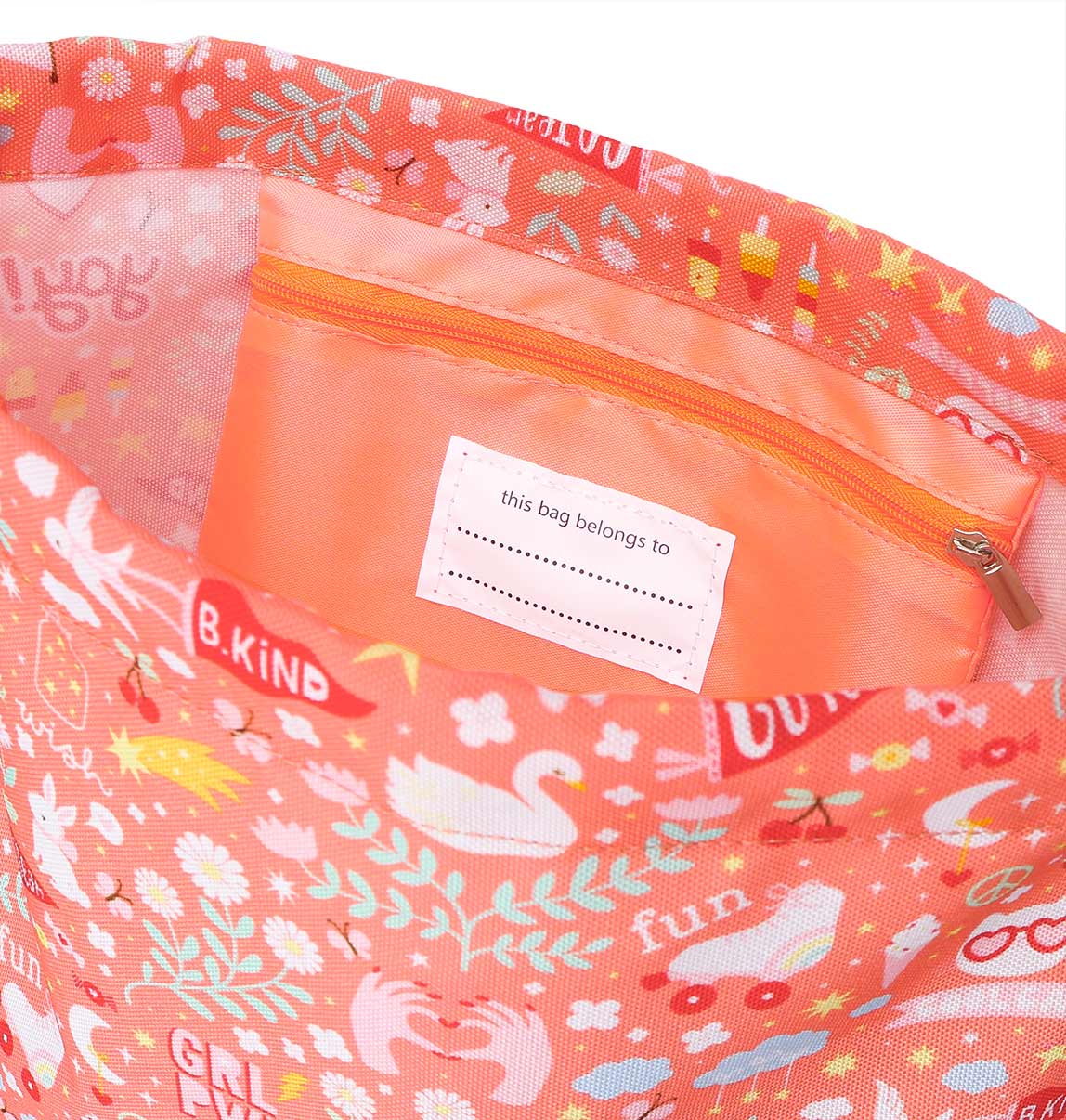 This purple gym bag with unicorns, flowers and rainbows is ideal for use as a sports bag for school or swimming lessons. The bag is lightweight, easy to open and close and has an inner pocket with zipper to safely store valuables.