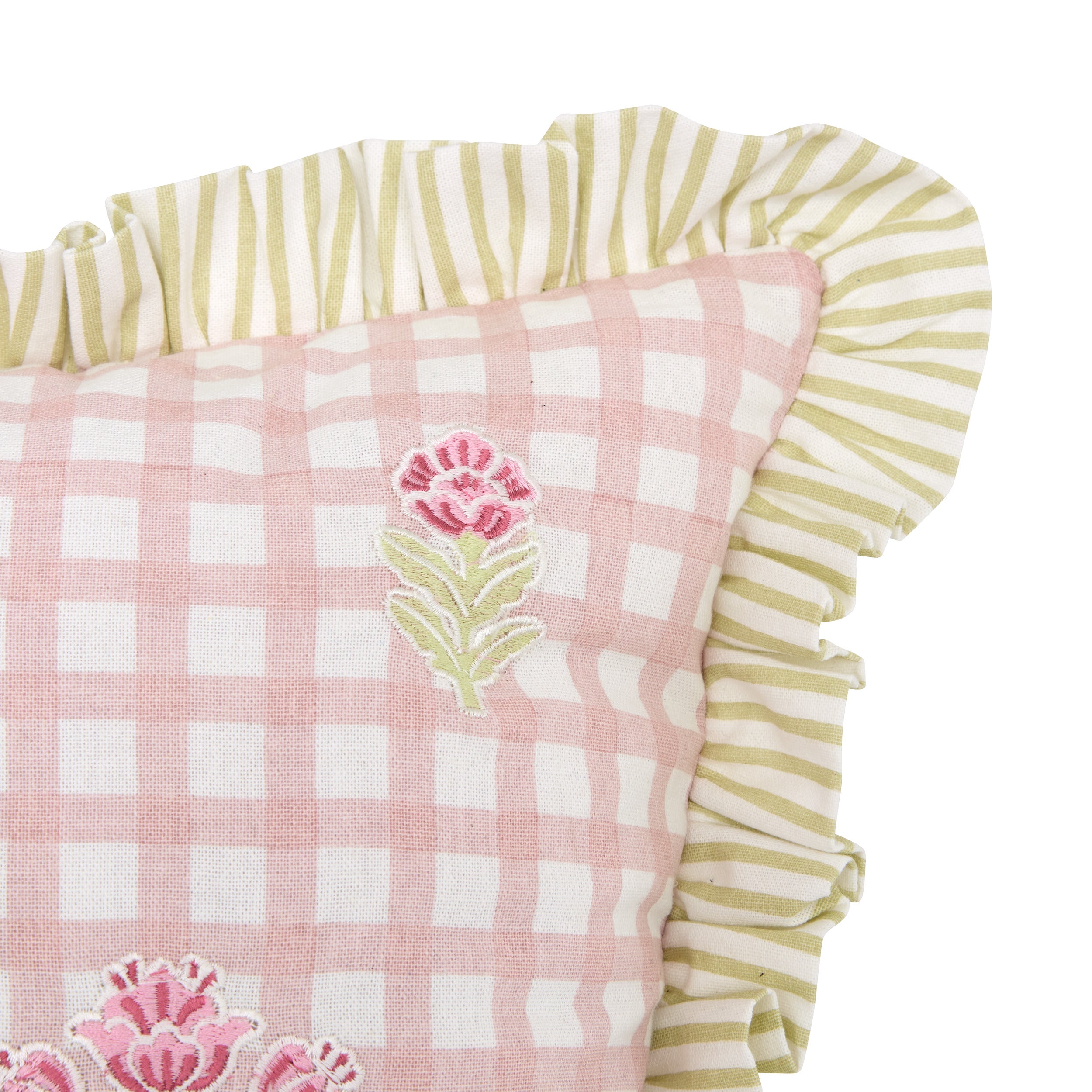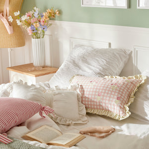 Dit rechthoekige kussen is gemaakt van katoen en heeft een charmante gingham-stof met geborduurde bloemmotieven. Het is bovendien afgewerkt met geschulpte randen in een bijpassende tint. Leg je Fleur de rose-kussen in je slaapkamer op het bed, samen met andere Atmosphera-kussens, om een gezellig en verfijnd beddengoed te creëren.