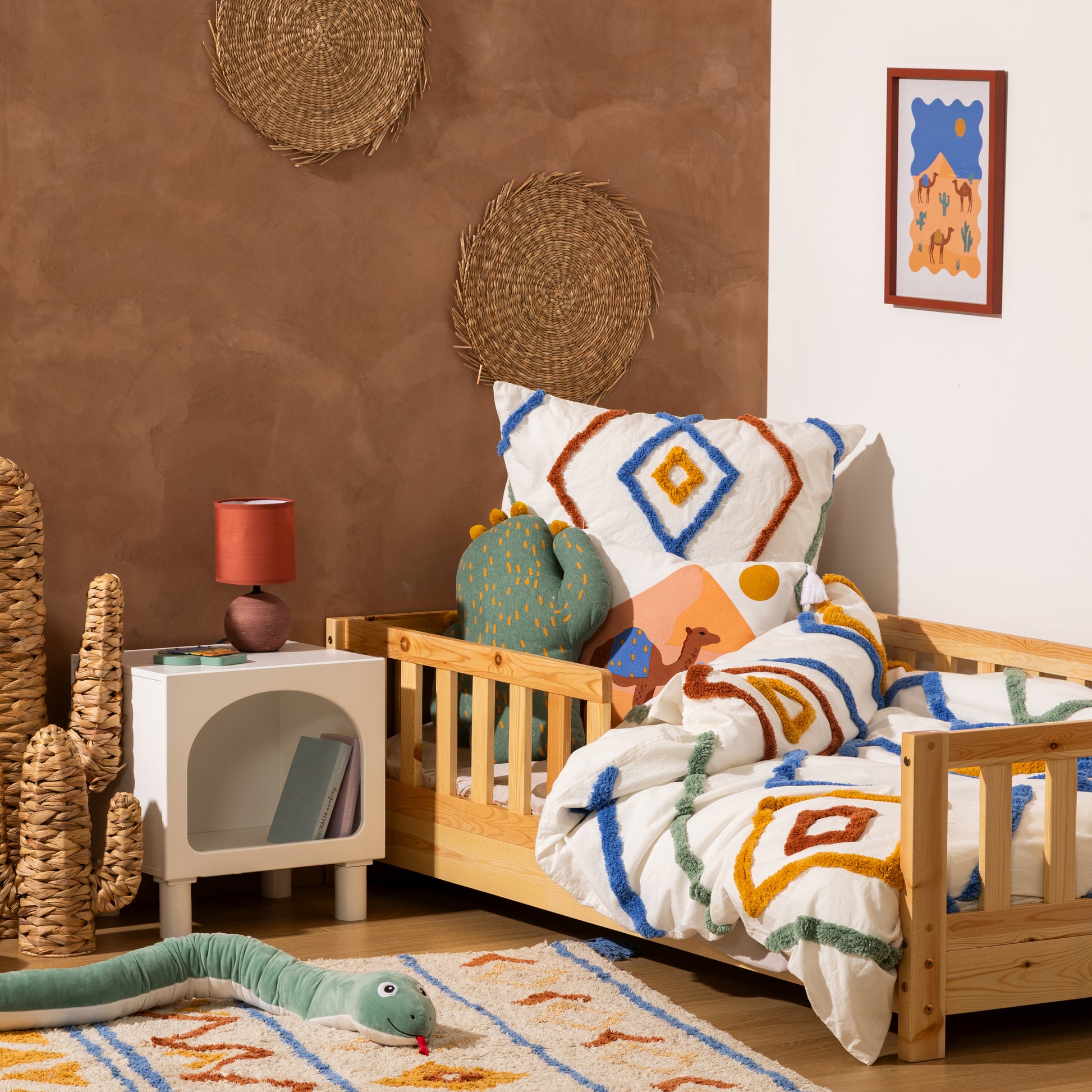 Breng kleur en karakter in de slaapkamer met deze speelse dekbedovertrek! Het frisse witte textiel is versierd met kleurrijke geometrische patronen in blauw, oker, groen en terracotta – perfect voor een kinderkamer of een interieur dat wel wat vrolijkheid kan gebruiken. Gemaakt van heerlijk zacht katoen voor optimaal slaapcomfort.