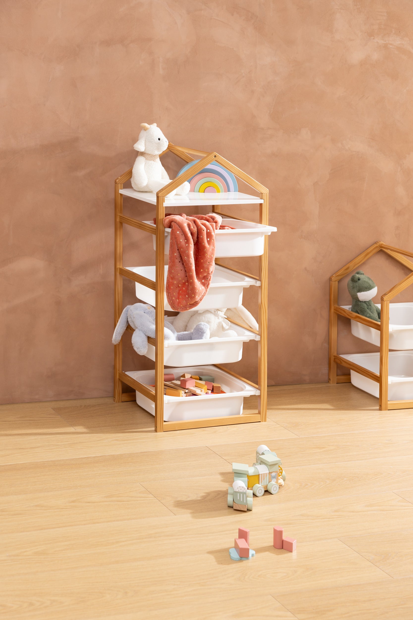 Combination of wood and colors to give a decorative touch to your child's room while still having storage space. 9 removable storage bins in different colors to transform it as you wish.