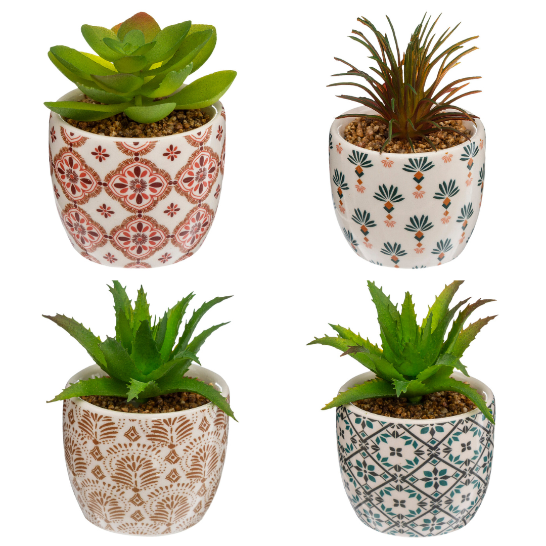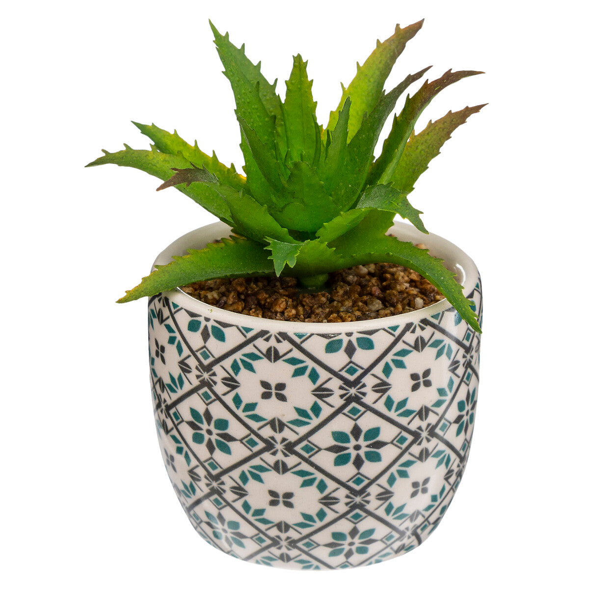 Deze kunstplant is een perfecte mix van verschillende vetplantvariëteiten en onderscheidt zich door de prachtige keramieken pot. Met deze kleine 9 cm hoge pot, versierd met verschillende delicate motieven, kun je je plant op een plank of in een boekenkast zetten.