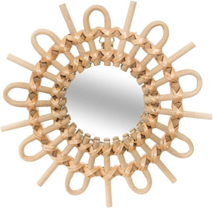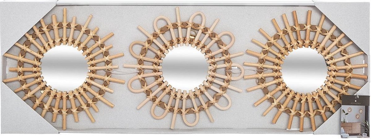 Nice set of 3 mirrors in 3 different designs in rattan. Beautiful to hang together or spread throughout your home. The mirrors have a diameter of 28 cm and are in a natural color.