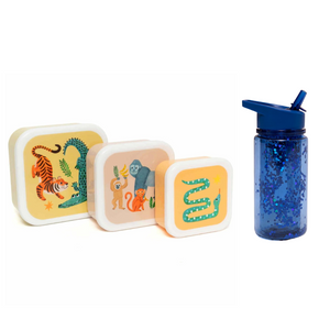 BEAU by Bo Petit Monkey Back to School set - Snackdozen + Drinkfles Upside Down Animals/Glitter - Blauw