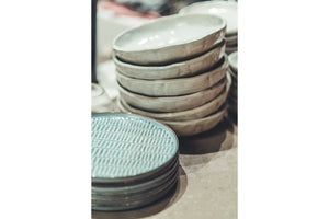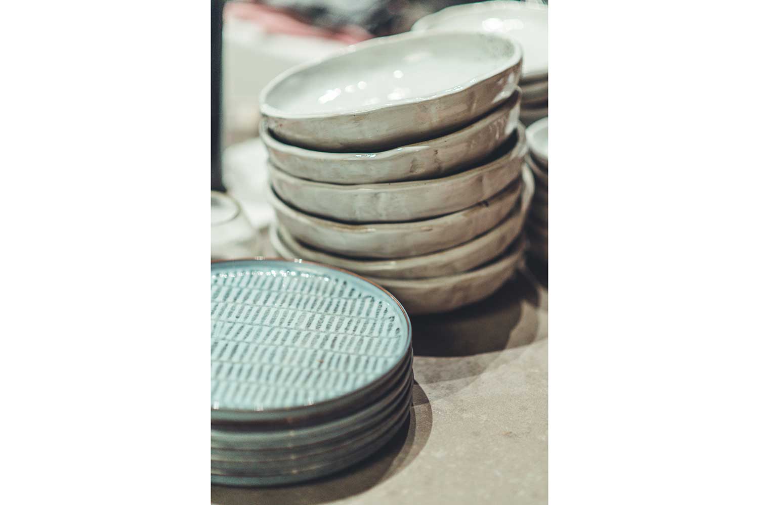 The very extensive tableware has two identities: firstly, there are bowls with irregular shapes and beautifully decorated edges, which have a strong artisanal character. The plates are completely different, which catch the eye because of their simplicity: flat geometric shapes without an edge.