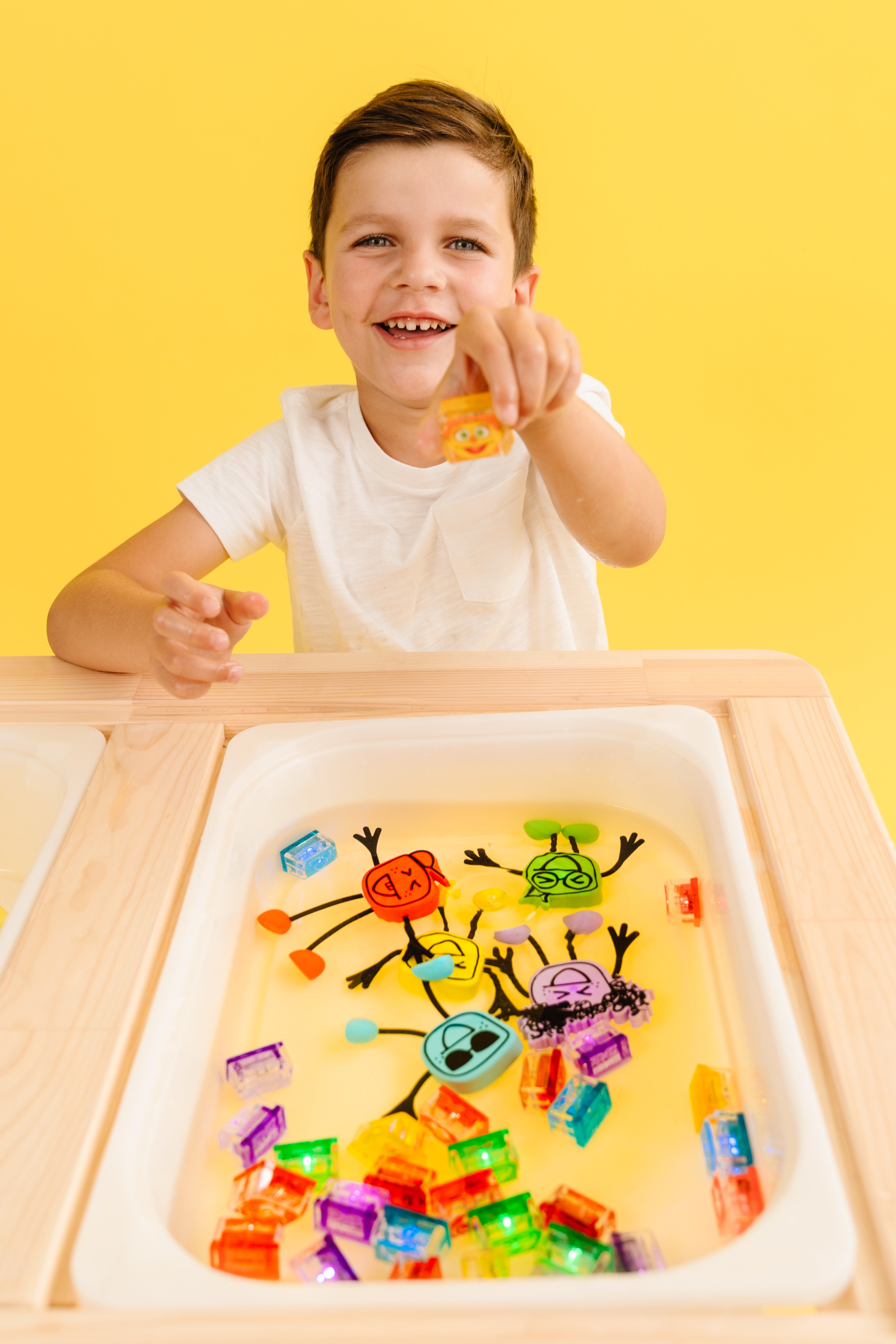 Deze poppetjes worden geleverd met 2 blokjes, gooi je poppetje of cube in het water en dan gaan de lampjes branden, super leuk om uren mee in het water te spelen. Elk poppetje heeft een eigen naam en kleur.