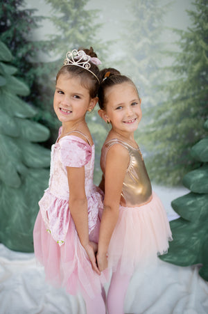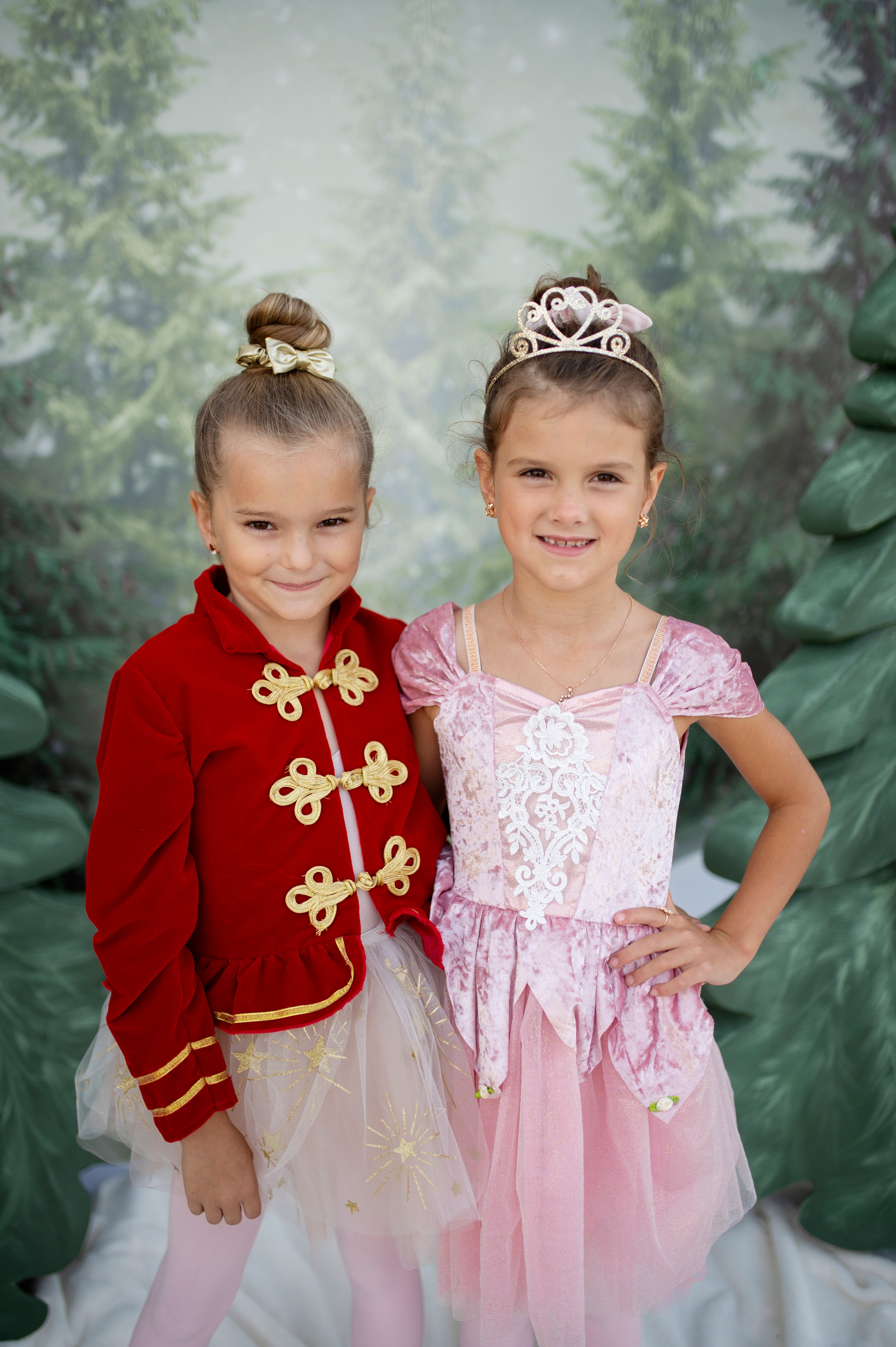 Steal the spotlight in our Holiday Ballerina dress! This beautiful dress is made from velvety fabric, features sparkling straps, lace details, floral accents and a lined tulle skirt designed for dancing! Perfect for holiday parties or year-round fun.