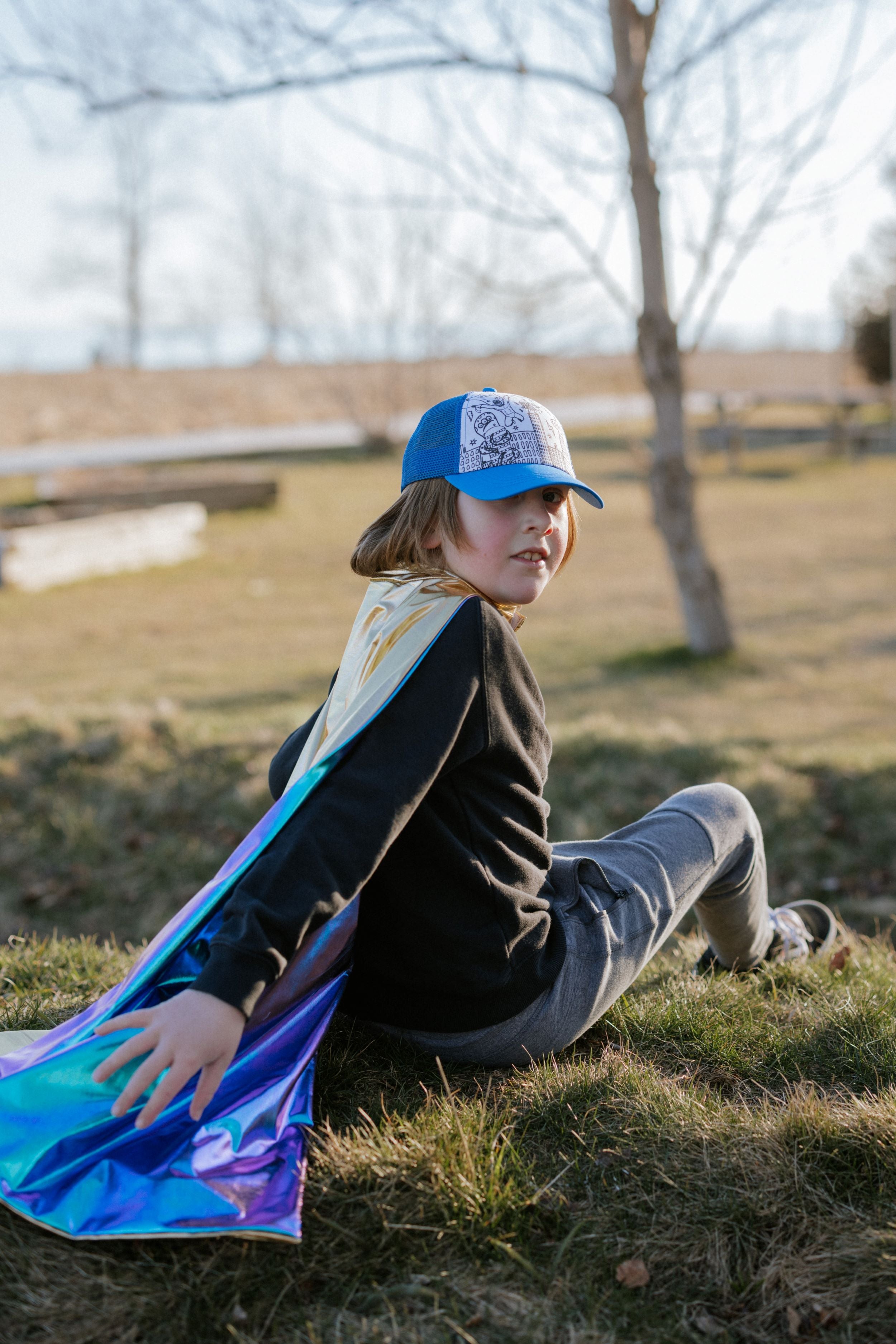 The Reversible Blue Lightning Holographic Cape is crafted with an eye for detail and features a fascinating holographic spandex fabric that sparkles with every movement. As you gracefully glide through each space, the cape's intricate patterns come to life, with breathtaking red and blue lightning bolts, evoking an aura of power and mystery.