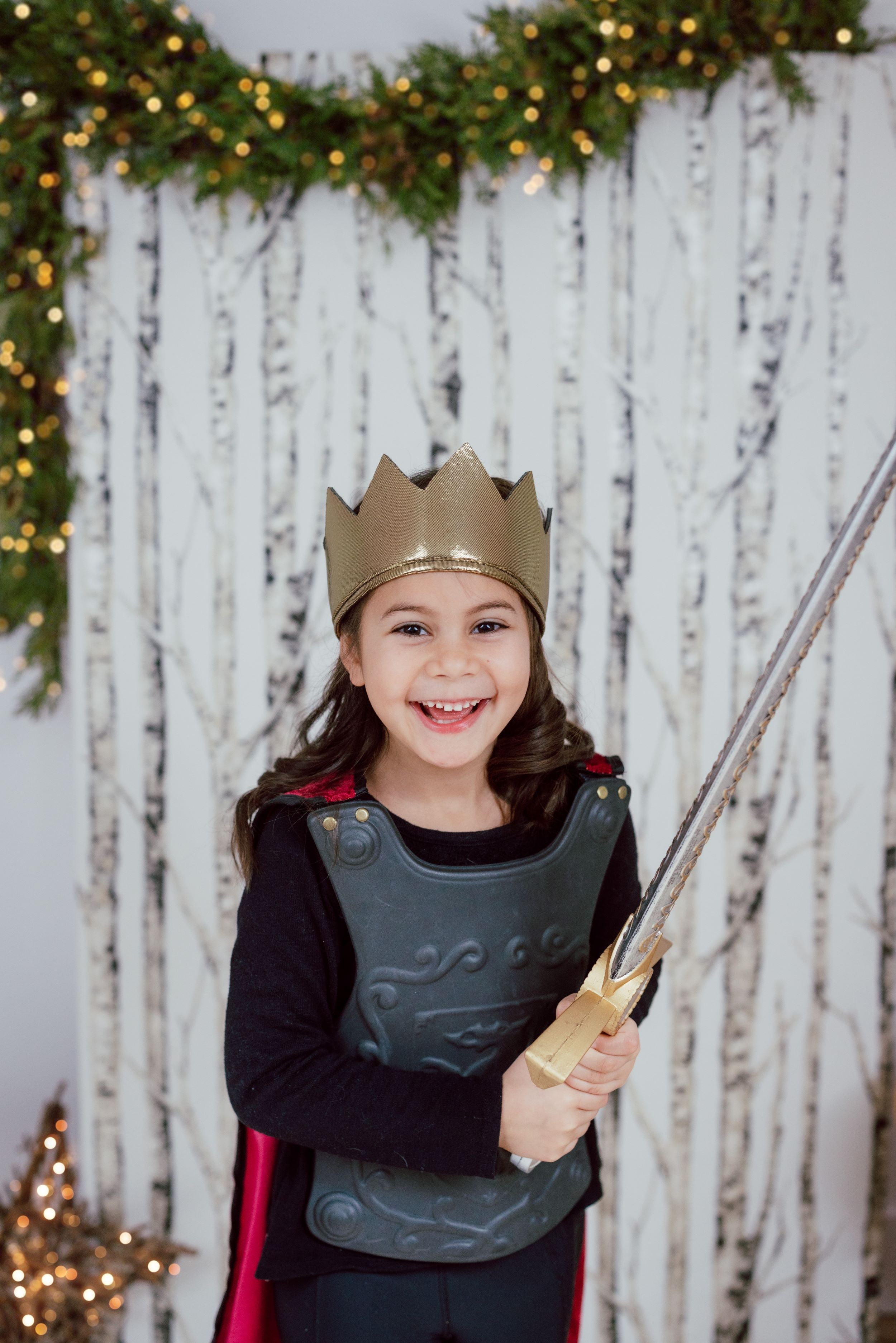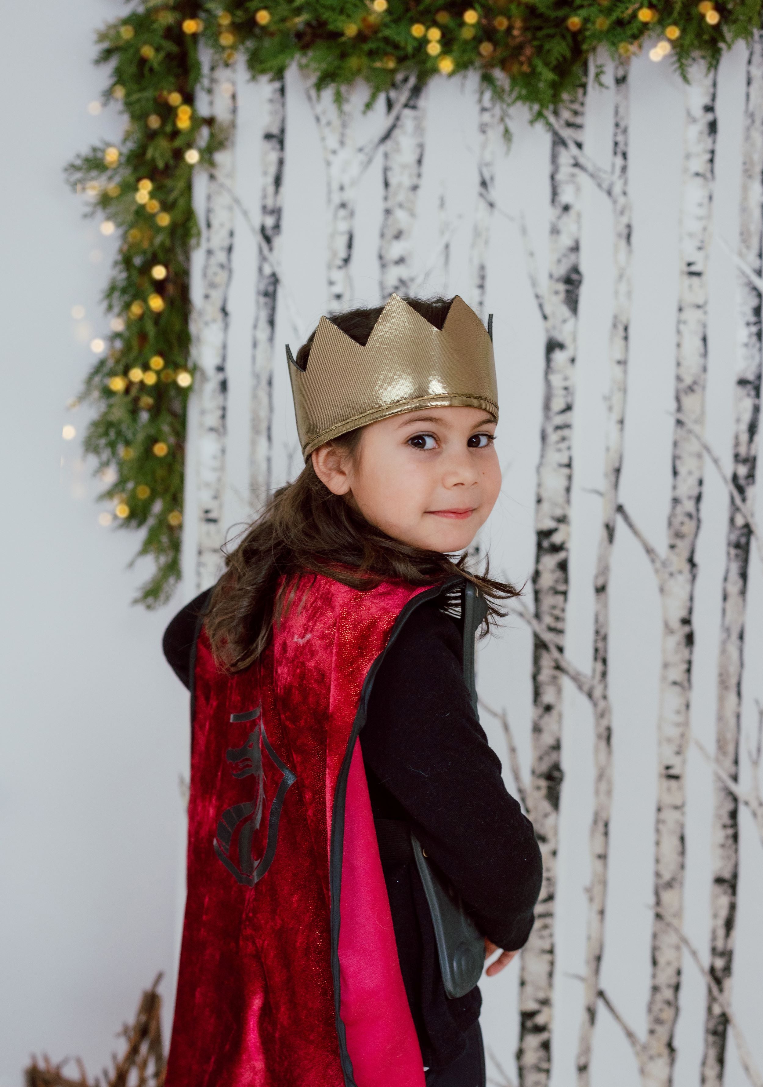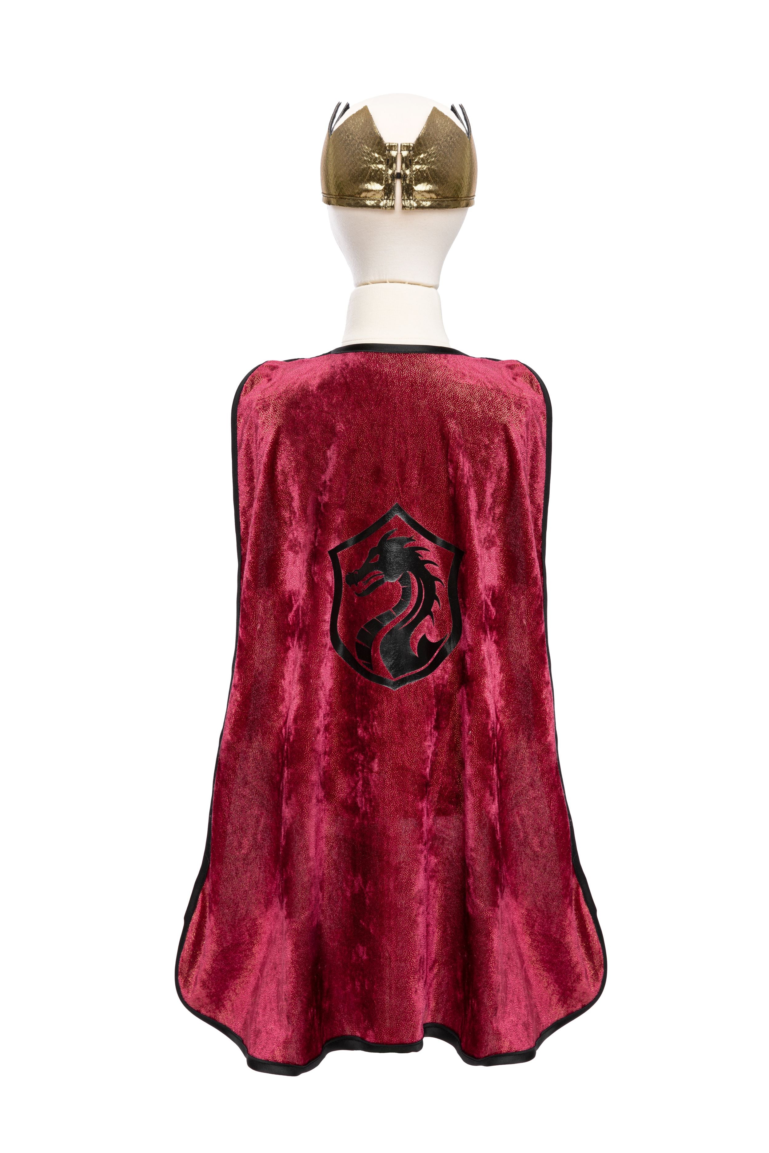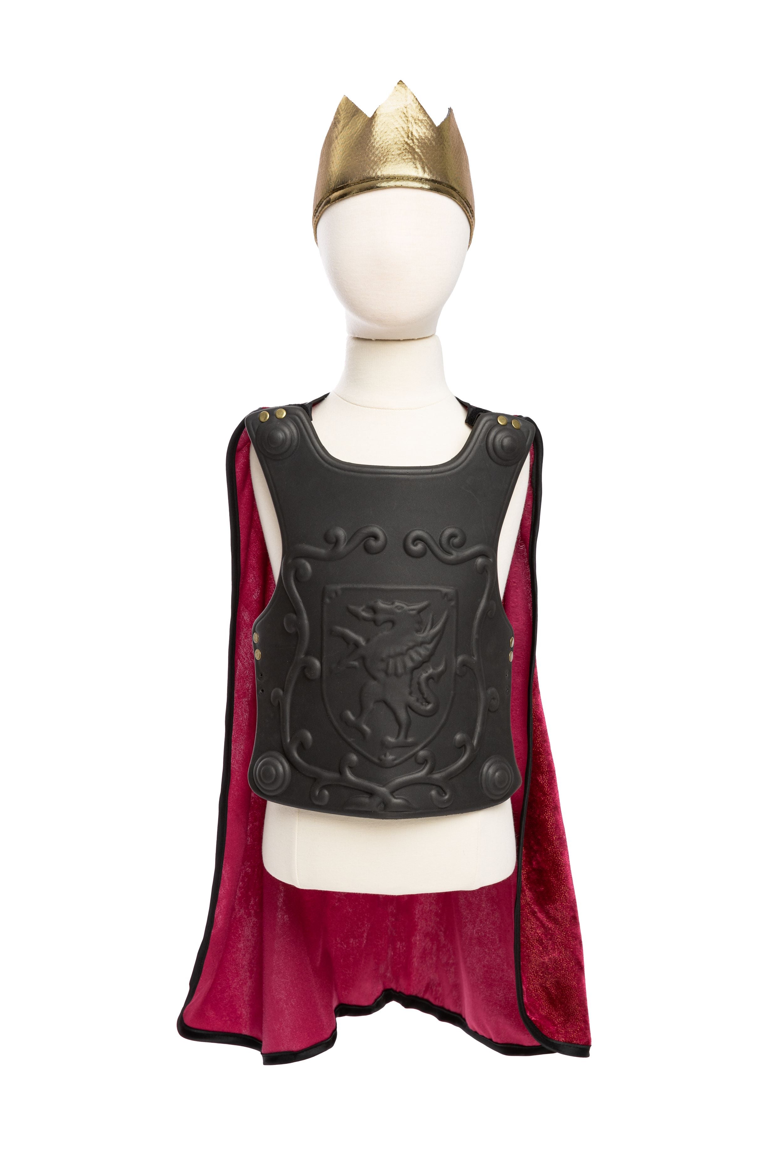 Attached to the breastplate is a regal red velvet cape, with the grandeur befitting a heroic knight. When your child puts on this ensemble, he or she will be ready to defend kingdoms and conquer imaginary dragons with style. To complete the royal look, the set includes a beautiful soft gold crown, which adds an extra touch of majesty.
