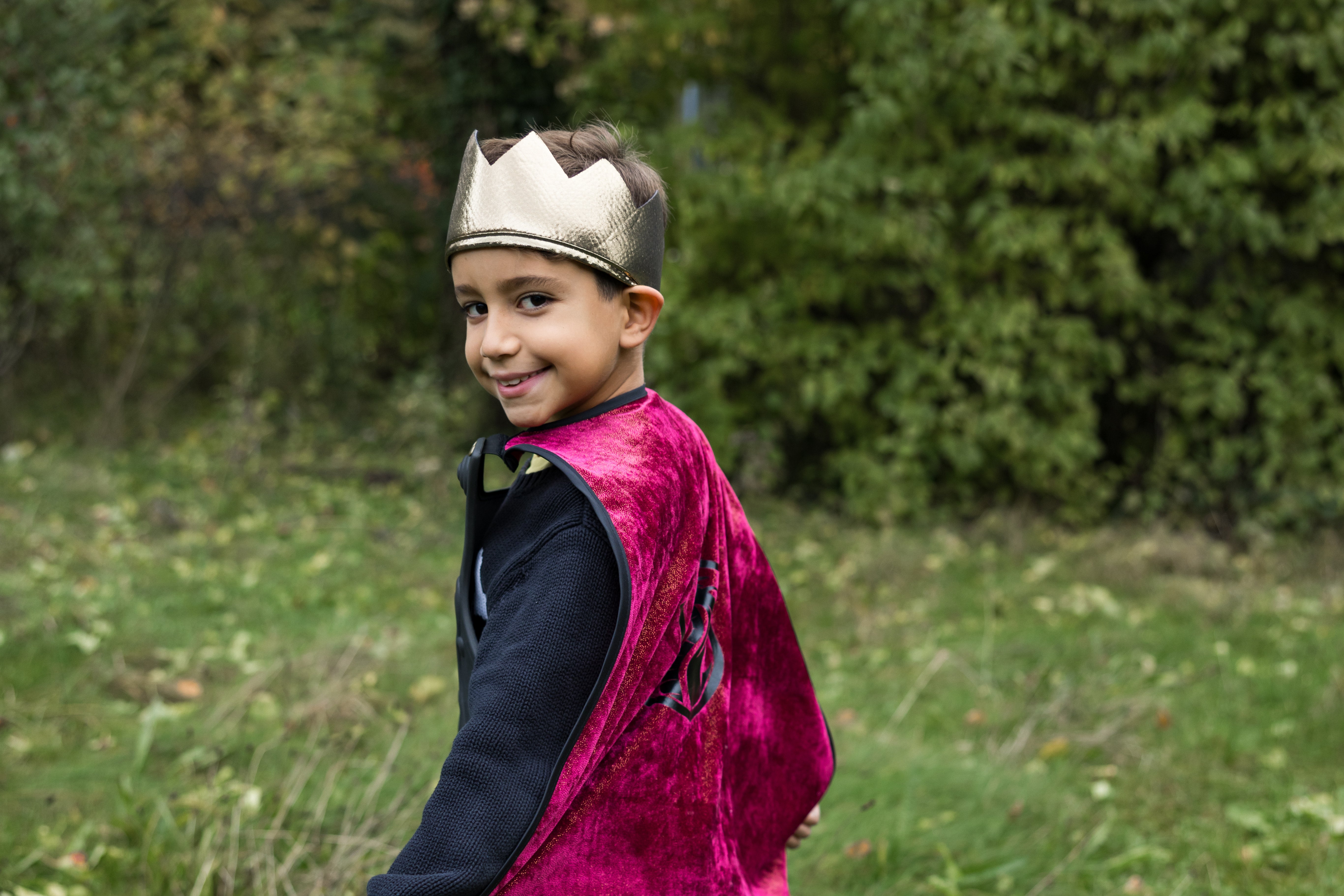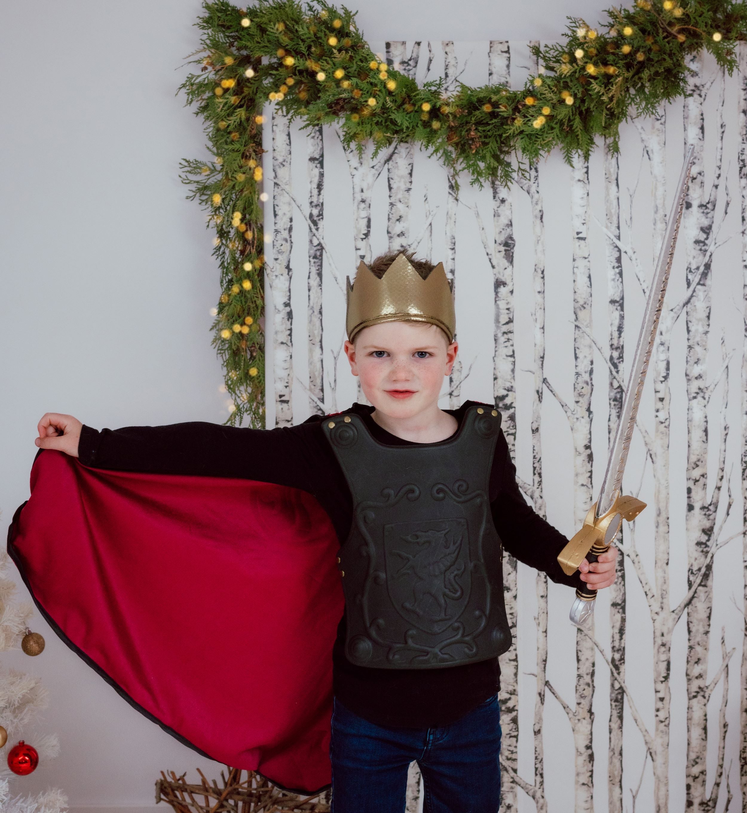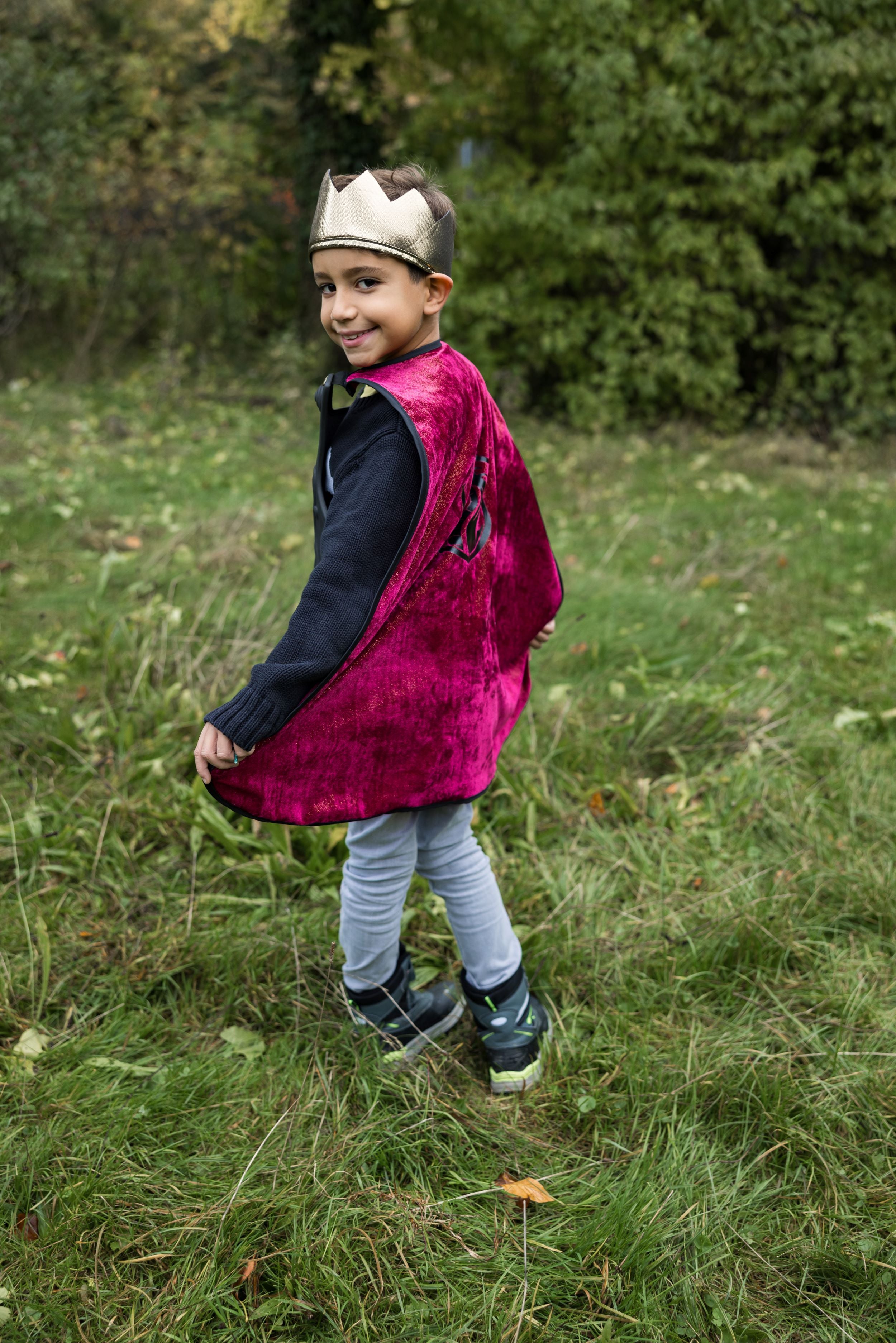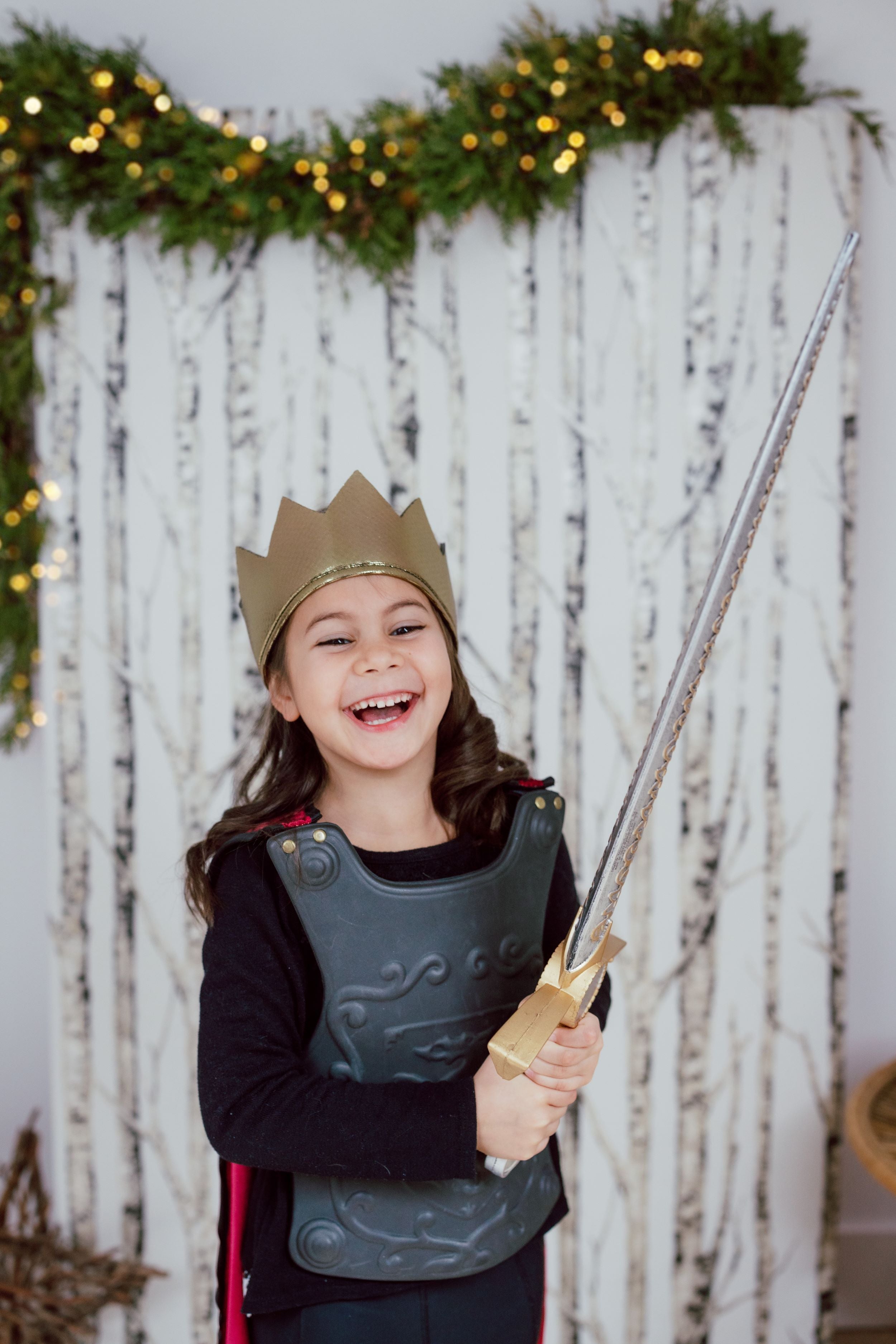 Attached to the breastplate is a regal red velvet cape, with the grandeur befitting a heroic knight. When your child puts on this ensemble, he or she will be ready to defend kingdoms and conquer imaginary dragons with style. To complete the royal look, the set includes a beautiful soft gold crown, which adds an extra touch of majesty.