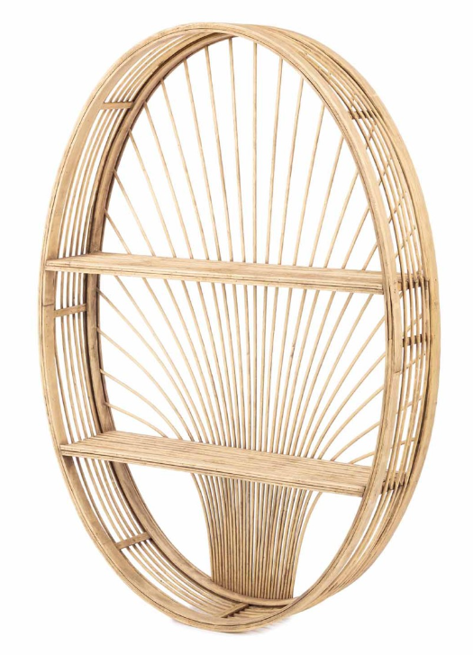 Wall rack of rattan in the shape of a moon, with 2 boards. Nice to use as a wall decoration and as a wall rack.