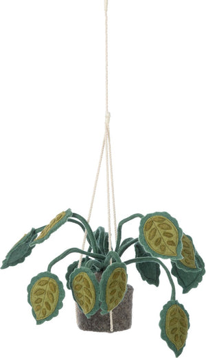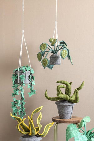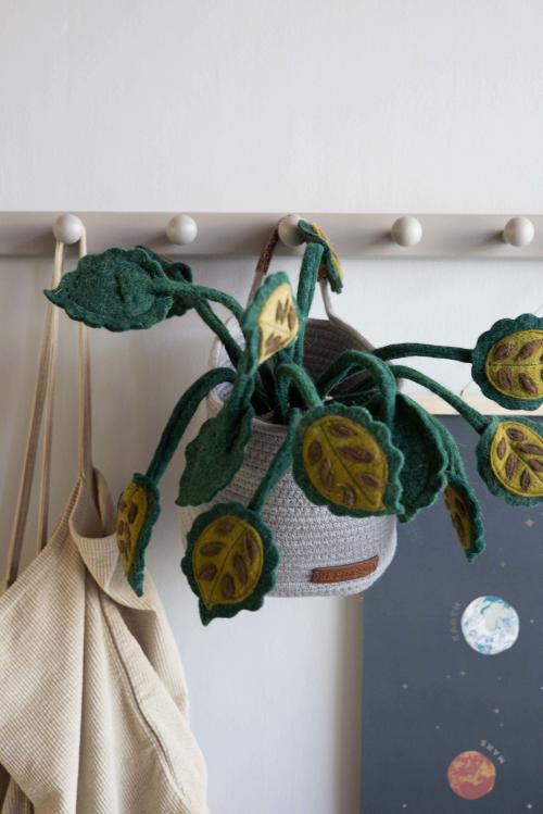 So cozy, hanging plants in the house! This is the Big Leaves from the felt plant collection from KidsDepot. The plant is in a gray pot and the large leaves have two shades of green.