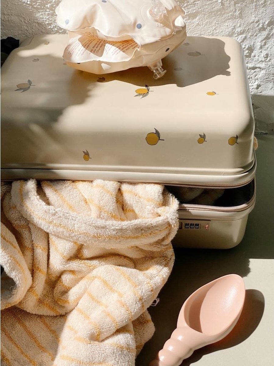 Mºsthave children's suitcase on wheels from the Konges Slojd collection. Beautiful hardcase suitcase with swivel wheels in the well-known lemon print by Konges Slojd. Your child will steal the show with this great children's suitcase with swivel wheels. The suitcase is printed on the outside with the Lemon print, it has a handy zipper and it can also be safely closed with the TSA lock. The children's suitcase has a side handle that makes it easy to lift and an extendable handle, so that the suitcase can ride behind you or next to you on the four swivel wheels. Fabric lining on the inside and a handy net to store smaller items. There is also a suspender closure that keeps all (children's) clothing neatly in place. The suitcase is not a toy. But you will make a splash during your holiday or a sleepover.