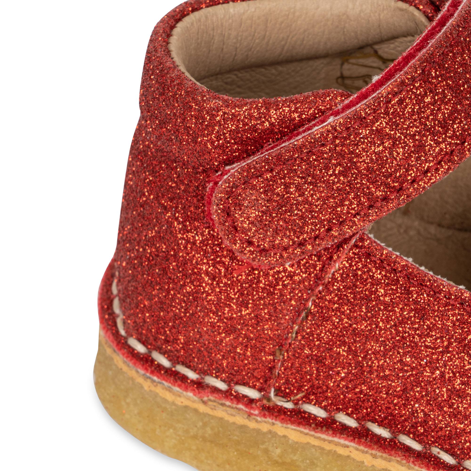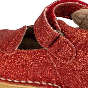 Comfortable glitter shoes with removable cushioned insole and reinforced heel. Designed with a single Velcro strap. Very ergonomic shape for growing feet.