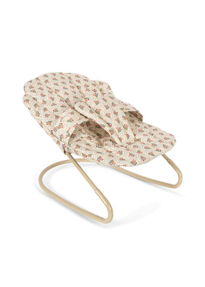 Bouncer made for dolls with easy Velcro closure suitable for a 40 cm tall doll. The fabric seat cushion is made from recycled cotton and has a recycled polyester filling on the inside. The seat is easy to remove and machine washable. The frame is made of metal.