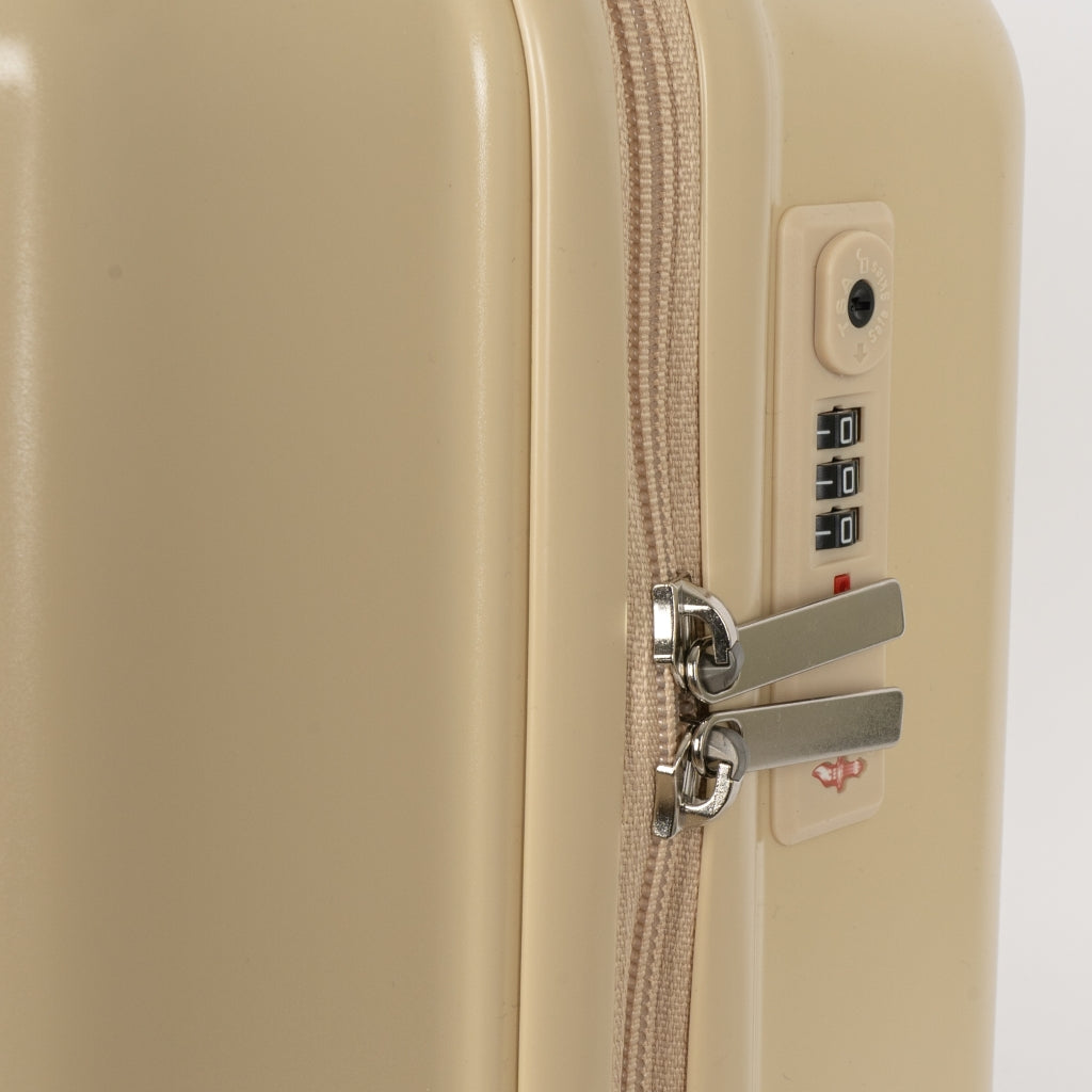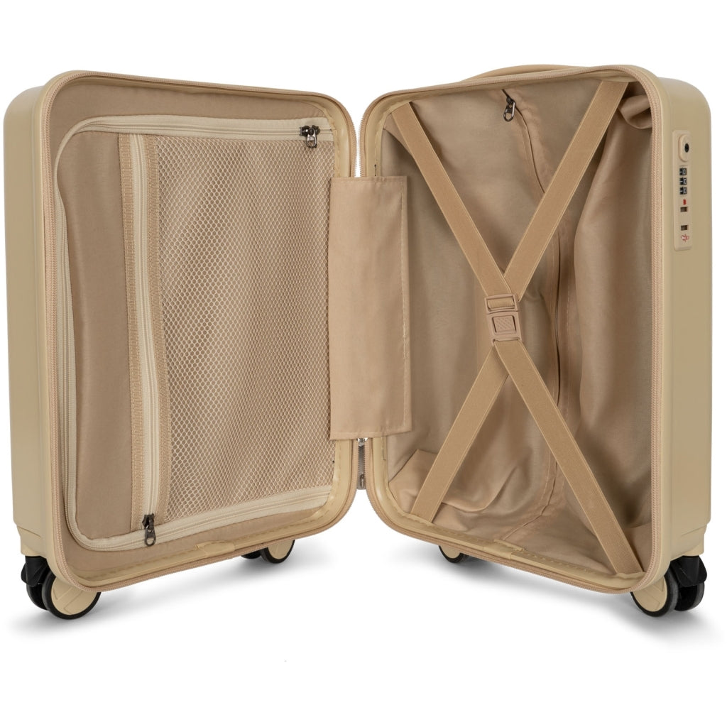 Lightweight cabin size carry-on luggage made with a hard shell, four dual 360 degree spinner wheels and an approved built-in coded TSA LOCK®. Equipped with a practical handle at the top and an adjustable aluminum telescopic handle in 3 steps. Designed with a bottom compartment with ribbons and a top compartment with zipper and a mesh mesh pocket.