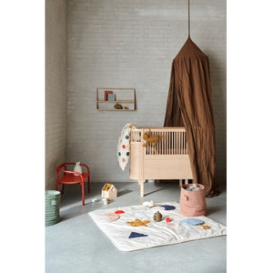 The mosquito net is made of 100% organic cotton. The mosquito net has a diameter of 50cm at the top and a diameter of 440cm at the bottom, so suitable for both a park and a crib and later for a junior bed.
