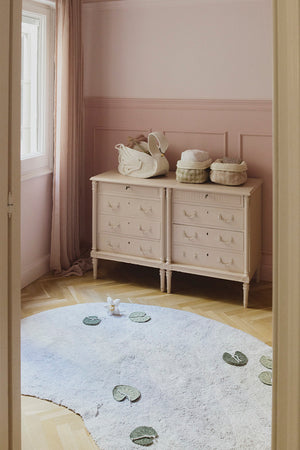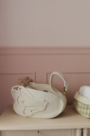 Breng een vleugje magie van het meer naar de kamer van uw kleintje met onze zwanenmand. Volledig met de hand gemaakt van touw, is elke vleugel liefdevol geknoopt en zijn de afzonderlijke panelen zorgvuldig bevestigd om de vorm te creëren. De met de hand geborduurde snavel en de zachte blauwe basis – als kalm, speels water – maken hem perfect voor het opbergen van kleine schatten of als lief accent in elke hoek.