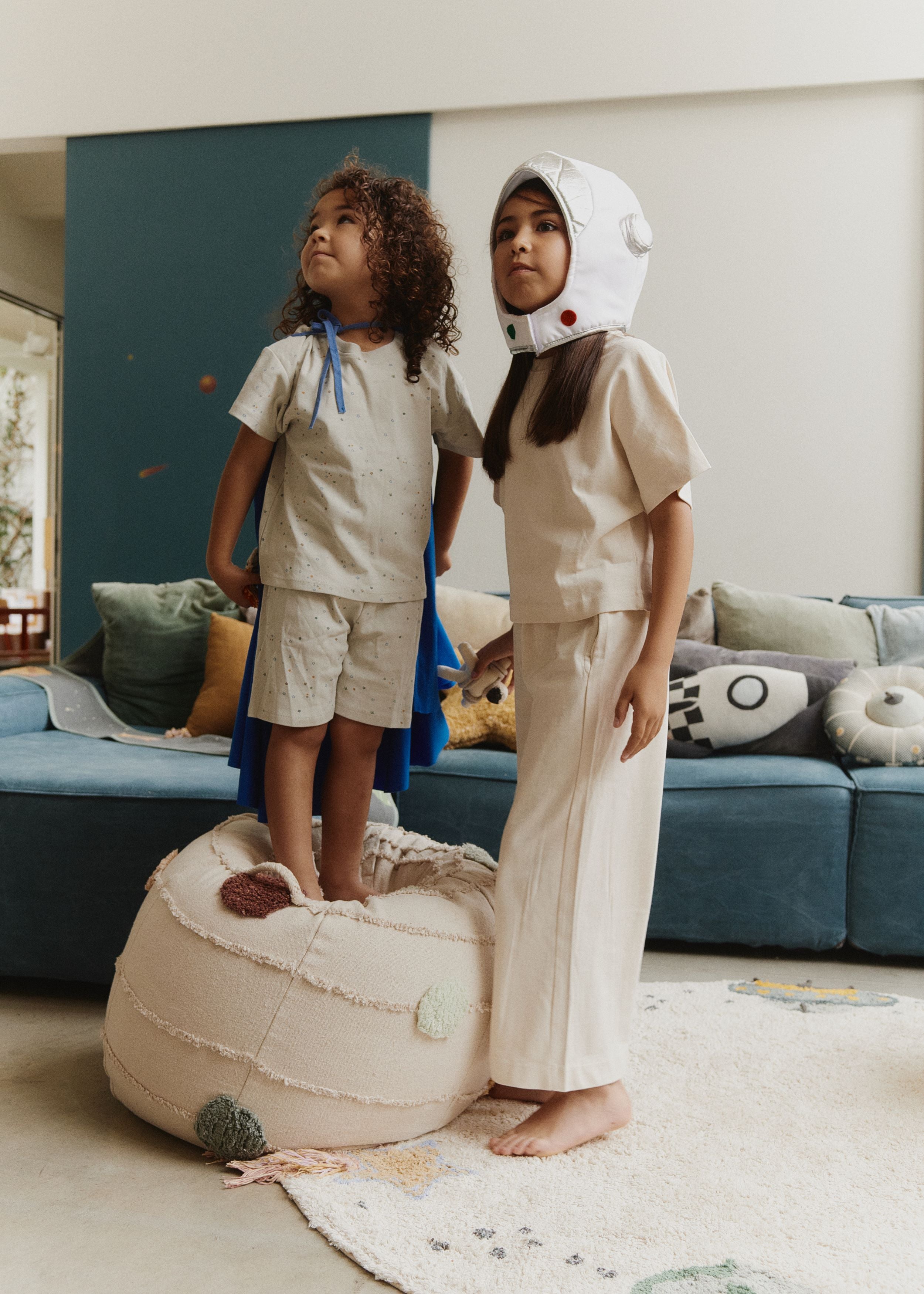 The Boletus pouffe combines a bottom of soft tufted cotton with a toffee-colored top with small knotted dots in natural colors. The ottoman is decorated on the side with two small mushrooms that are handmade from braided cotton cords. The cover is removable with a zipper and can be easily washed. The inner filling is filled with lightweight polystyrene beads.