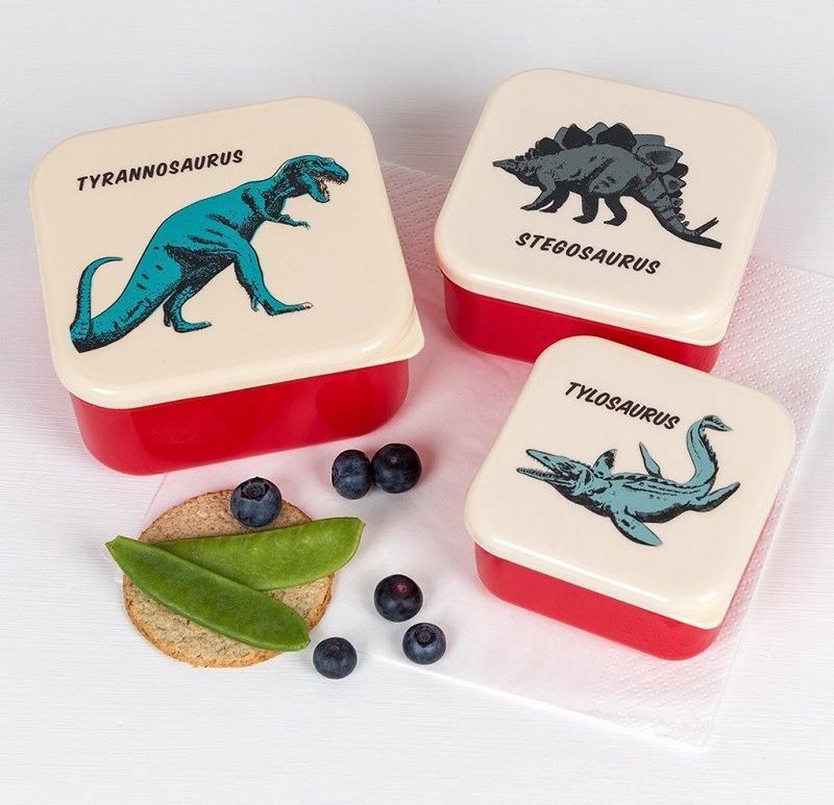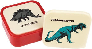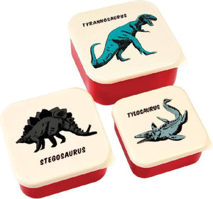 Three BPA-free snack boxes from Rex London with a print of a cool Tyrannosaurus, Stegosaurus and Tylosaurus. There are three sizes of containers that fit together for easy storage when not in use.