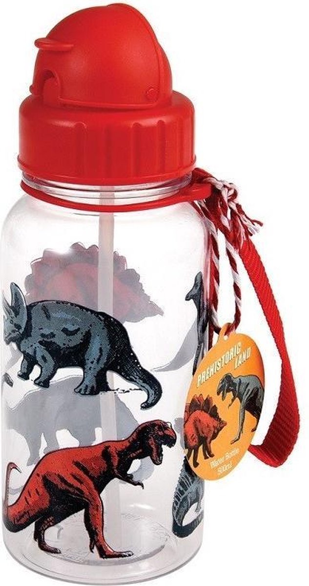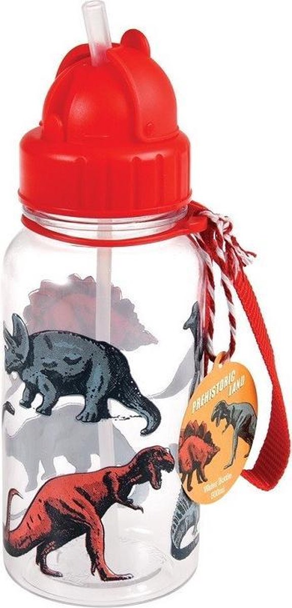 Transparent BPA-free drinking bottle Prehistoric Land from Rex London with a print of various dinosaurs from Rex London. The drinking bottle has a straw, making it easy for the little one to drink with this drinking cup.