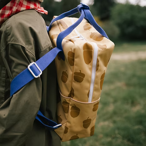 Joepie! These small backpacks are made of recycled PET bottles. At the front you will find an extra box. The lining is waterproof. The zippers are from YKK and the shoulder rods are adjustable. On the inside you will find an elastic bottle holder and a compartment over the entire back that closes with Velcro. You can write your name and contact details on the nameplate.