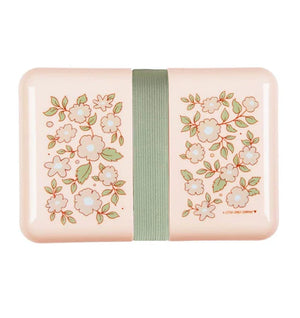 Boîte à pain avec élastique et fleurs sur le couvercle. Le tambour se compose de deux parties qui glissent l'une sur l'autre et possède un compartiment spacieux pour le déjeuner.