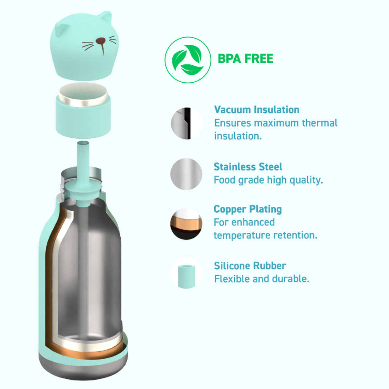 Onder de dierenkop zit een normale lekvrije dop. In de drinkfles voor kinderen zit een uitneembaar siliconen rietje om de drinkervaring makkelijker te maken.