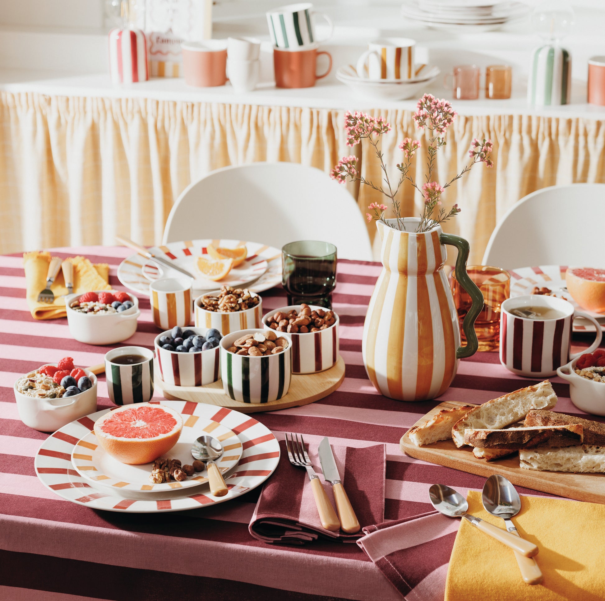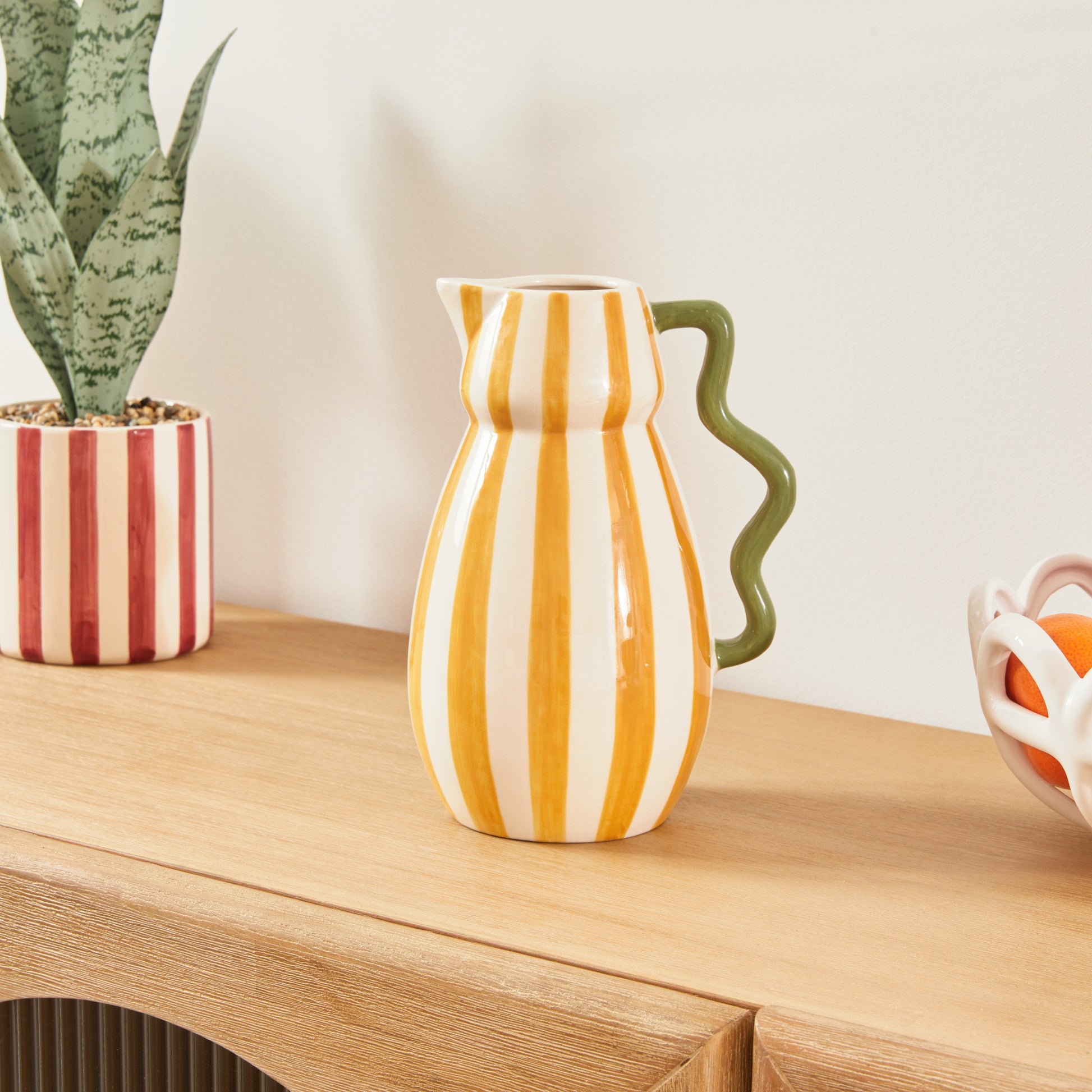 De Cheri Atmosphera-vaas doet denken aan de iconische creaties van de Memphis Milano-beweging en heeft de vorm van een ronde karaf, maar dan met een handvat dat gebogen en excentrische lijnen volgt. Deze vaas van geglazuurd steengoed heeft levendige kleuren en harmonieuze afmetingen en kan worden tentoongesteld op een houten meubelstuk of in het midden van een eettafel, eenmaal gevuld met bloemen. Laat uw fantasie de vrije loop en wissel af tussen natuurlijke bloemstukken en kunstbloemen.